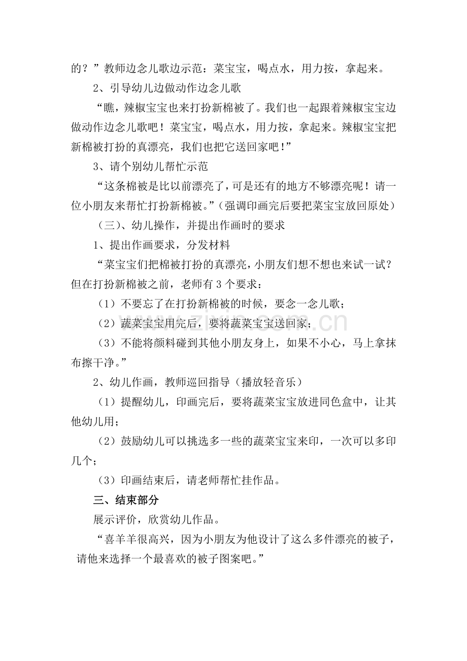 “这条棉被是比以前漂亮了,可是还有的地方不够漂亮呢!请一位小朋友来帮忙打扮新棉被。”(强调印画完后要把菜宝宝放回原处)