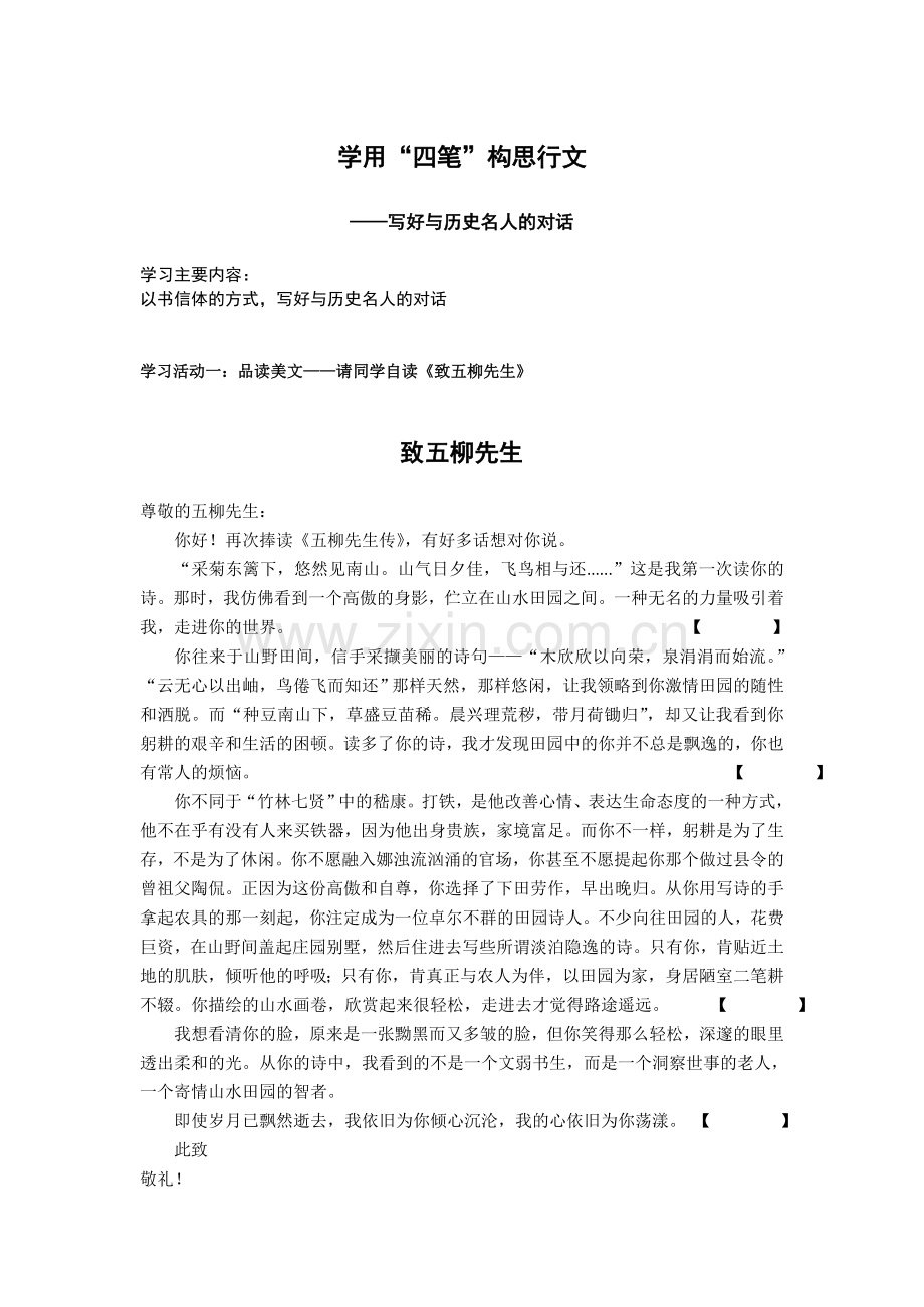 学习活动二:教师讲析——《致五柳先生》在写作上给我们的启迪