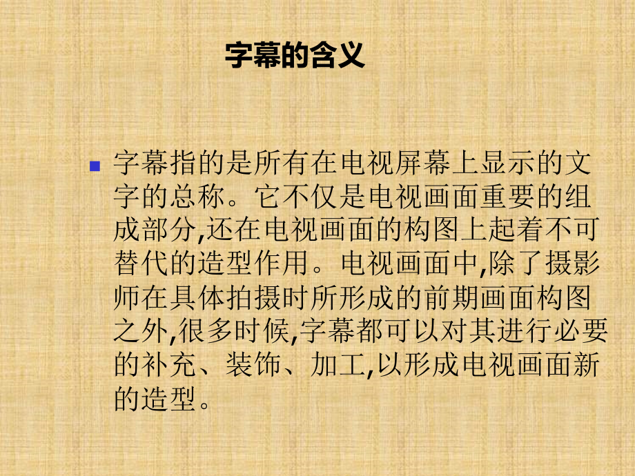 单击此处编辑母版标题样式,单击此处编辑母版文本样式,第二级,第三级,第四级,第五级,*,字幕的作用和表现形式,字幕的含义,字幕指的是所有在电视屏幕上显示的文字的总称。它不仅是电视画面重要的组成部分,还在电视画面的构图上起着不可替代的造型作用。电视画面中,除了摄影师在具体拍摄时所形成的前期画面构图之外,很多时候,字幕都可以对其进行必要的补充、装饰、加工,以形成电视画面新的造型。,字幕的作用,事实上,几乎每一种类型的节目都会不可避免地运用到字幕。,新闻节目:,在新闻节目中,它体现在对重要信息的展示,如重要文件内容的摘录、数字的出现、标题的出现等。,字幕的作用,纪录片和专题节目,在纪录片和专题节目中,它要对在画面中出现的人或者其他事物如时间、地点、景物名称等进行相应的介绍和说明,字幕的作用,体育节目,在体育节目中,字幕更是给广大观众提供了及时的赛场信息,如比分以及出场和被替换队员的名单等。,电视是一门视听结合的艺术。字幕便能很好地体现这种艺术的特征。,在现在的电视节目当中,字幕已经成为电视传媒系统不可缺少的一个组成部分,它与电视的图像、声音、特技等一起组成了一种共时间共空间的多方位多信息渠道的传播手段,它提高了单元时间内信息传播的速度和质量,;,还能从视听两个方面强化重要信息,加强信息的准确性、明晰性,减少听觉的误差。更重要的是它可以作为电视画面构成的一部分参与到电视画面的构图当中,除了对某些视觉部分起到有效的强调作用外,还能给人们以视觉上的美感。有时候,仅仅字幕本身就能完成表意的作用。而更多的时候,字幕则是和相应的声音,(,音乐,),以及图像一起来完成表情达意的功能。,字幕的表现形式,一、字体本身的装饰,字幕是由字构成的。而无论是中国字还是外国字,我们都可以在形式上对其进行装饰,例如可以在字的大小、颜色、字体风格等方面进行相应的变化。因此,多变的字体形式也可以对字幕本身起到装饰作用。,我们的汉字字体的风格种类变化多样,从书法的角度,汉字可分为楷、行、草、魏、隶等,而楷书里面又可细分为颜体、柳体、赵体等。现在在电脑里也可以安装的字体有很多,如姚、仿宋、瘦金、宋、黑、行楷等。“汉字书法具有很高的审美意义。尤其是毛笔书法,写作时,笔画可粗可细,勾画的线条具有极强的刚柔变化,无论苍劲厚重,还是婀娜挺秀,无不给人美的享受。”可以说中国书法悠久的历史中形成的各种书体和各种丰富多彩的表现样式都可以被拿来利用。除了中国的这些字体,国外的文字当中英语的变化种类也有很多,很多软件公司已经推出了形式各异、品种繁多的字体种类。作为电视画面的编辑,对此一定要有足够的了解。只有在充分熟悉了各种字体的风格样式以及表现力等特点之后,在实际运用过程当中才会得心应手。,字幕的表现形式,二、字幕的运动方式,字幕的运动方式指的是字幕在电视画面中是以何种方式出现、存在以及退出的。字幕都是为了单独或者配合画面表达一定的信息,而单个电视画面的时空容量都非常有限,所以屏幕上的字幕都要呈现这一过程。而字幕在电视画面中运动的这三个步骤也可以对电视画面的造型起到很大作用。,字幕在屏幕上的出现是有讲究的,它可以采用“飞出式”,也可以采用“闪人式”,还可以采用“插入式”等,如今的字幕机上已经为我们设计了各种各样的运动方式,这些运动方式各有特点,作用不尽相同,在具体运用时要看当时的电视画面在表现什么,以便和电视画面很好地配合。比如说,在做严肃的纪录片时,为了使片子看起来稳重,片头字幕的出现方式要大方,速度要偏缓慢;而在做娱乐类节目的片头时,片头节目名称和节目中随着人物谈话交流时飞出的字幕相比之下在速度上就要加快,以配合节目夸张火爆的氛围,充分调动观看者的情绪。,字幕的表现形式,还有一点需要注意的是字幕在电视画面上停留的时间问题。字幕在屏幕上存在的时间是由其所配合的画面信息和人的视觉习惯决定的。如果画面上信息比较多,字幕本身的字数和难理解程度又比较高,例如在纪录片,河之南,中经常出现古代的文献资料节选。那么此时字幕的停留时间就应该相对长一些,以保证观众在你给定的时间内能看得完屏幕上的信息。反之,如果画面上的字幕所要表现的信息比较少,过长的停留时间反而会破坏片子的节奏。总之,应根据画面上的信息内容加以调整。,字幕的表现形式,三、音乐与字幕的配合使用,字幕在画面当中的运用可以配合相应的音乐,从而能够起到良好的表意效果。在很多电视纪录片中,除了在必须的段落采用字幕以交代故事情节或者画面当中的时间、地点之外,为了烘托相应的气氛和制造某种情绪,在运用字幕的同时我们经常会看到制作者刻意地使用音乐。而一旦有了音乐的配合,字幕的运动便要随着音乐的旋律遵循相应的节奏,否则,字幕的运动就会和音乐不和谐,发挥不出应有的表现力。例如,在北京广播学院举行的齐越朗诵艺术节的节目中,为了显示“声音”的凝重和历史感,唤起观众对我国播音教学事业的回忆,画面上字幕的处理就别具匠心。首先,为了突出庄重、肃穆的效果,制作者大胆地采用了黑背景、白字体;此外,在字幕的运动速度上也充分考虑到了使用