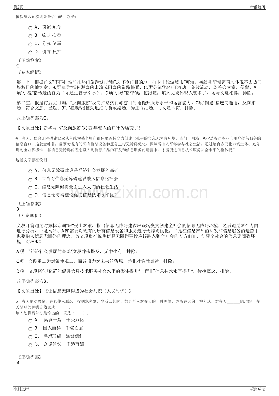 2024年武汉地铁招聘笔试冲刺题(带答案解析)【下载须知】:1,本套练习包含以下题型:言语理解与表达题、常识判断题、数量关系题、判断推理题和资料分析题等题型;共135道。2、本套试题根据常见招考题总结归纳,主要用于练习答题思路和拓展知识面。3、本套试题非考试真题,且与武汉地铁无关。一、第一部分言语理解与表达(本部分包括表达与理解两方面的内容。请根据题目要求,在四个选项中选出一个最恰当的答案。)1、莫罗城堡扼守哈瓦那港,高耸的城堡通过木吊桥和石通道与外相连,堡内四通八达的隧道、厚重的石门、嘎吱作响的木梯,都给城堡 了历史感。与堡内 的空间形成鲜明对比,堡顶是拥抱大海与蓝天的开阔地。几台锈迹斑斑的大炮一字排开,仿佛在诉说着当年的悲壮历史。依次填入划横线部分最恰当的一项是:A增进 斜仄 B增设 狭仄 C增添 逼仄 D增补 险仄正确答案C专家解析第一空,搭配“历史感”,且根据“高耸的城堡通过木吊桥和石通道与外相连,堡内四通八达的隧道、厚重的石门、嘎吱作响的木梯”可知,横线处所填词语强调城堡内的物品和设置让城堡的历史感更加厚重,C项“增添”指添加,加多,D项“增补”指增添补充,均符合文意,且与“历史感”搭配恰当,保留。A项“增进”指增加并促进,题干并未强调城堡内的物品和设置可以促进历史感,且与“历史感”搭配不当,排除;B项“增设”指在原有的以外再设置,比如增设选修课,增设门市部,多搭配具体事物,与“历史感”搭配不当,排除。第二空,根据“形成鲜明对比”可知,堡内与堡顶呈现相反特征,故横线处所填词语与“开阔地”语义相反,强调堡内空间不开阔、狭窄,C项“逼仄”指(地方)狭窄,符合文意,当选。D项“险仄”指崎岖而狭窄,比喻艰难险阻,更多侧重“险”,与文意不符,排除。故正确答案为C。【文段出处】历经沧桑的莫罗城堡2、_这并非说明人类有多强壮,实际上如果仅仅是比拼搏击,很多动物都可以轻易打败人类。但是,人类从来不喜欢遵循自然原本的法则,面对对自己存在生命威胁的生物,人类避免正面接触,打不过跑,跑完了还可以制造陷阱,设计圈套来对付你。管你是身形矫健的猎豹还是凶残威武的狮虎,怎么能斗得过狡猾的人类呢?而且,人类居安思危的良好传统会促使人类研究更有效的攻破对手的“战略战法”,不仅要求屡战屡胜,还要求速战速决。填入横线部分最恰当的一句是()。A 人类已经降伏了自然界中的所有生物 B 人类不断挑战自然界原本的生存法则 C 自然界里再也寻找不到人类的天敌了 D 人类不惧怕自然界中任何的生存挑战正确答案B专家解析划线处位于文段的第一句,因此,首先应该考虑划线处和下句内容的连贯性。横线之后“这并非说明人类有多强壮,实际上如果仅仅是比拼搏击,很多动物都可以轻易打败人类”,转折词“实际上”后面指出动物本可以打败人类,那么前面的内容就应该是人类打败动物。再根据后文强调的人类能够打败对自己有危险的生物,可知空白处应该填入人类战胜生物的内容。3、越来越多的年轻人,不再扎堆前往热门旅游城市,而是选择“反向旅游”:通过选择冷门目的地、打卡非旅游城市、“宅”式度假的方式,让自己的假期更加舒适。“反向旅游”对一些热门旅游目的地的 ,能够 其提升景区的服务水平和运营能力,而不是躺在自然资源上坐地收钱。第1页考前练习冲刺上岸祝您成功依次填入画横线处最恰当的一项是:A引流 迫使 B疏导 推动 C分流 倒逼 D引导 反推正确答案C专家解析第一空,根据前文“不再扎堆前往热门旅游城市”和“选择冷门目的地、打卡非旅游城市”可知,横线处所填词语应体现不去热门旅游目的地之意。B项“疏导”指使淤塞的水流或阻塞的道路畅通,C项“分流”指分开流动,分散流动,均符合文意,保留。A项“引流”指传送的行为(如通过管子引水),D项“引导”指带领,使跟随,填入文段体现人变多了,均与文意相悖,排除。第二空,根据前后文可知,“反向旅游”反向推动热门旅游目的地提升服务水平和运营能力。C项“倒逼”指逆向逼迫,反向推动,符合文意,当选。B项“推动”指使劲地推向前或摇动,为正向推动,与文意不符,排除。故正确答案为C。【文段出处】新华网“反向旅游”兴起 年轻人的口味为啥变了4、今天,信息无障碍建设应从单纯为某个用户群体服务转变为创建全社会的信息无障碍环境。当前,网站、APP是各行各业向用户提供服务的信息窗口,这就意味着,需要对现有的所有信息设备和服务进行无障碍优化,保障所有人平等参与社会生活。通过培育多元化市场主体、充分调动企业积极性,将信息无障碍的理念融入到信息产品的研发和信息服务的运营中,才能促进信息技术服务社会水平的整体提升。这段文字意在说明:A信息无障碍建设是经济社会发展的基础 B应当将信息无障碍建设融入信息化社会 C信息无障碍将全面进入人们的社会生活 D信息无障碍建设促使信息技术水平提升正确答案B专家解析文段开篇通过对策标志词“应”提出对策,指出信息无障碍建设应该转变为创建全社会的信息无障碍环境,之后通过两个方面进行分析,一是网站、APP需要对现有的所有信息设备和服务进行无障碍优化,二是在信息产品的研发和信息服务的运营中也要融入信息无障碍的理念。故文段重在说明信息无障碍建设