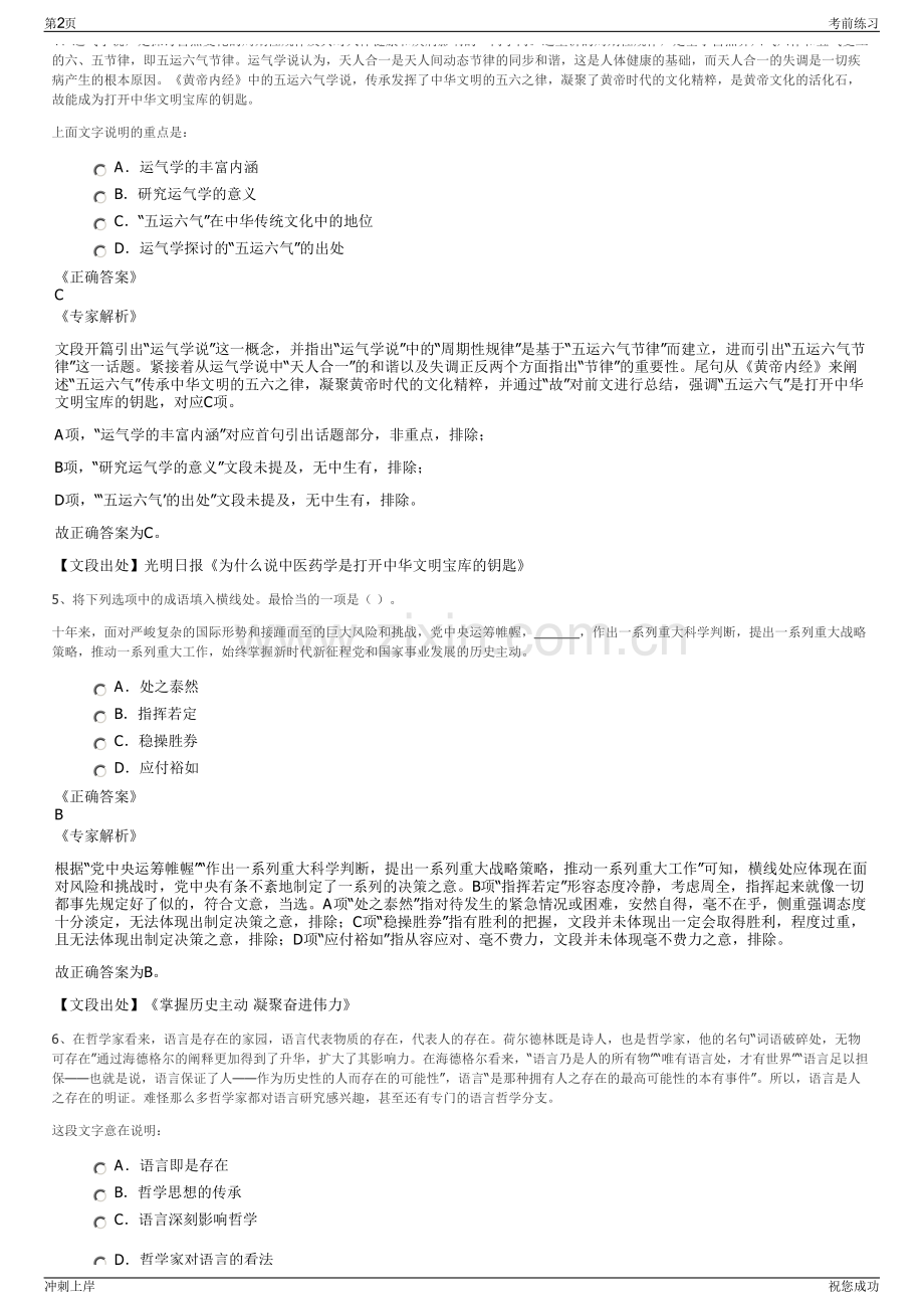 2024年贵州宜兴化工有限公司招聘笔试冲刺题(带答案解析)【下载须知】:1,本套练习包含以下题型:言语理解与表达题、常识判断题、数量关系题、判断推理题和资料分析题等题型;共135道。2、本套试题根据常见招考题总结归纳,主要用于练习答题思路和拓展知识面。3、本套试题非考试真题,且与贵州宜兴化工有限公司无关。一、第一部分言语理解与表达(本部分包括表达与理解两方面的内容。请根据题目要求,在四个选项中选出一个最恰当的答案。)1、如今埃及木偶仍保持着传统的提线木偶的表演方式,虽然不及现代木偶表演惟妙惟肖,但诙谐幽默的人物形象还是令人_,再配以阿拉伯传统音乐,埃及几千年的文明历史都_在这小小的舞台上。填入划横线部分最恰当的一项是()。A 笑逐颜开压缩 B 欣喜若狂展现 C 忍俊不禁浓缩 D 心花怒放凝聚正确答案C专家解析第一空,“笑逐颜开”多形容人满脸堆笑的表情和喜悦心情。“欣喜若狂”是指高兴得像发狂了一样,形容高兴到了极点。“忍俊不禁”是指忍不住要发笑。“心花怒放”是指心里高兴得像鲜花盛开一样,形容非常高兴。由“诙谐幽默的人物形象”可知,“忍俊不禁”使用最恰当。因此C项正确。2、现代人看起来太忙了,许多人在这忙碌的世界上生活,手脚不停。就好像在阿尔卑斯山上旅行,乘汽车匆匆忙忙地走过,没有时间回一回头,或者停一停步子,欣赏一下风景。结果,使这原本丰富美丽的世界,在我们眼中空无所有,只剩下匆忙和紧张、劳碌和忧愁。这段文字意在说明()。A 美丽的世界对工作繁忙的人而言没有太大意义 B 人们除了工作外,对其他事情都不太感兴趣 C 人们应懂得去欣赏美丽的世界 D 人们为了生活而无暇顾及周围世界的变化正确答案C专家解析文段的主要意思是告诉人们应该懂得去欣赏美丽的世界,不能只顾着忙碌,否则原本丰富美丽的世界,在我们眼中空无所有,即人们应懂得去欣赏美丽的世界,因此答案选C。3、毫无疑问,睡眠对于每个人都必不可少,但在一些_情况下,我们需要抛开生物节律的_,长时间保持清醒状态。头悬梁、锥刺股固然可行,但过于_,这时人们就不得不借助一些促清醒的药物。依次填入划横线部分最恰当的一项是()。A 意外局限得不偿失 B 非常限制矫揉造作 C 特殊安排强人所难 D 极端束缚触目惊心正确答案D专家解析B项错误,第三空,“矫揉造作”比喻故意做作,不自然,而文意强调头悬梁、锥刺股过于极端,故用在此处不合适。C项错误,第二空,“安排”的主体只能是人,不应是生物节律。第一空,“意外”和“极端”相比,表现不出情况的特殊性,后者语义更重,只有极端情况下,才需要选择头悬梁、锥刺股的行为。因此D项正确。4、运气学说,是探讨自然变化的周期性规律及其对人体健康和疾病影响的一门学问。这里讲的周期性规律,是基于自然界六气六律和五气更立第1页考前练习冲刺上岸祝您成功4、运气学说,是探讨自然变化的周期性规律及其对人体健康和疾病影响的一门学问。这里讲的周期性规律,是基于自然界六气六律和五气更立的六、五节律,即五运六气节律。运气学说认为,天人合一是天人间动态节律的同步和谐,这是人体健康的基础,而天人合一的失调是一切疾病产生的根本原因。黄帝内经中的五运六气学说,传承发挥了中华文明的五六之律,凝聚了黄帝时代的文化精粹,是黄帝文化的活化石,故能成为打开中华文明宝库的钥匙。上面文字说明的重点是:A运气学的丰富内涵 B研究运气学的意义 C“五运六气”在中华传统文化中的地位 D运气学探讨的“五运六气”的出处正确答案C专家解析文段开篇引出“运气学说”这一概念,并指出“运气学说”中的“周期性规律”是基于“五运六气节律”而建立,进而引出“五运六气节律”这一话题。紧接着从运气学说中“天人合一”的和谐以及失调正反两个方面指出“节律”的重要性。尾句从黄帝内经来阐述“五运六气”传承中华文明的五六之律,凝聚黄帝时代的文化精粹,并通过“故”对前文进行总结,强调“五运六气”是打开中华文明宝库的钥匙,对应C项。A项,“运气学的丰富内涵”对应首句引出话题部分,非重点,排除;B项,“研究运气学的意义”文段未提及,无中生有,排除;D项,“五运六气的出处”文段未提及,无中生有,排除。故正确答案为C。【文段出处】光明日报为什么说中医药学是打开中华文明宝库的钥匙5、将下列选项中的成语填入横线处。最恰当的一项是()。十年来,面对严峻复杂的国际形势和接踵而至的巨大风险和挑战,党中央运筹帷幄,作出一系列重大科学判断,提出一系列重大战略策略,推动一系列重大工作,始终掌握新时代新征程党和国家事业发展的历史主动。A处之泰然 B指挥若定 C稳操胜券 D应付裕如正确答案B专家解析根据“党中央运筹帷幄”“作出一系列重大科学判断,提出一系列重大战略策略,推动一系列重大工作”可知,横线处应体现在面对风险和挑战时,党中央有条不紊地制定了一系列的决策之意。B项“指挥若定”形容态度冷静,考虑周全,指挥起来就像一切都事先规定好了似的,符合文意,当选。A项“处之泰然”指对待发生的紧急情况或困难,安然自得,毫不在乎,侧重强调态度十分淡定,无法体现出制定决策之意,排除;C项“稳操胜券”指有胜利的把握,文段并未体现出一定会取得胜利,程度过重,且