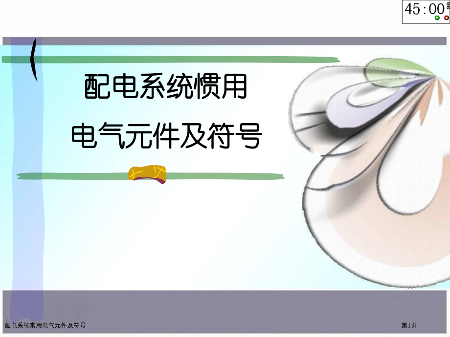 Click to edit Master title style,Click to edit Master text styles,Second level,Third level,Fourth level,Fifth level,*,*,单击此处编辑母版标题样式,单击此处编辑母版文本样式,第二级,第三级,第四级,第五级,*,单击此处编辑母版标题样式,单击此处编辑母版文本样式,第二级,第三级,第四级,第五级,*,配电系统惯用,电气元件及符号,配电系统常用电气元件及符号,第1页,中压(,35kV,、,10kV,、,6kV,),柜子图片,主要名称:,KYN,系列、,XGN,系列、,GG1A,、,SF6,配电系统常用电气元件及符号,第2页,中压(,35kV,、,10kV,、,6kV,),一次系统元件:真空断路器,图片,电气符号,功效:,控制和保护高压电气设备,配电系统常用电气元件及符号,第3页,中压(,35kV,、,10kV,、,6kV,),一次系统元件:电压互感器,图片,电气符号,功效:把高电压按百分比关系变换成,100V,或更低等级标准二次电压,供保护、计量、仪表装置使用。,配电系统常用电气元件及符号,第4页,中压(,35kV,、,10kV,、,6kV,),一次系统元件:电流互感器,图片,电气符号,功效:把数值较大一次电流经过一定变比转换为数值较小二次电流,(5A,、,1A),,用来进行保护、测量、计量等用途。,测量绕组,计量绕组,保护绕组,配电系统常用电气元件及符号,第5页,中压(,35kV,、,10kV,、,6kV,),一次系统元件:接地刀开关,图片,电气符号,功效:作为检修时确保人身安全,用于接地一个机械地装置。,配电系统常用电气元件及符号,第6页,中压(,35kV,、,10kV,、,6kV,),一次系统元件:隔离开关,图片,电气符号,功效:用于隔离电源,将高压检修设备与带电设备断开,使其间有一显著可看见断开点。,配电系统常用电气元件及符号,第7页,中压(,35kV,、,10kV,、,6kV,),一次系统元件:避雷器,图片,电气符号,功效:用来保护电力系统中各种电器设备免受雷电过电压、操作过电压、工频暂态过电压冲击而损坏一个电器。,配电系统常用电气元件及符号,第8页,中压(,35kV,、,10kV,、,6kV,),一次系统元件:带电显示器,图片,电气符号,功效:直接安装在室内电气设备上,直观显示出电气设备是否带有运行电压提醒性安全装置。,配电系统常用电气元件及符号,第9页,中压(,35kV,、,10kV,、,6kV,),二次系统元件:综保,图片,电气符号,功效:为线路、电容器、电动机等不一样回路提供保护,是集测量、控制、保护、通讯为一体数字微机保护装置。,配电系统常用电气元件及符号,第10页,中压(,35kV,、,10kV,、,6kV,),二次系统元件:电力继电器,图片,电气符号,功效:依据电压、电流等物理量改变来接通或切断电路,起保护和控制作用。,配电系统常用电气元件及符号,第11页,中压(,35kV,、,10kV,、,6kV,),二次系统元件:开关柜综合测控装置,图片,电气符号,功效:一次回路模拟图及开关状态指示,高压带电显示,自动温湿度控制,电参数测量及通讯接口,集操作、显示于一体。,开关状态指示,配电系统常用电气元件及符号,第12页,中压(,35kV,、,10kV,、,6kV,),二次系统元件:温湿度控制器,图片,电气符号,功效:用于中高压开关柜等设备内部温度和湿度调整控制,预防因低温、高温造成设备故障以及受潮或结露引发爬电、闪络事故发生。,应用场所,配电系统常用电气元件及符号,第13页,中压(,35kV,、,10kV,、,6kV,),二次系统元件:综合检测仪表,图片,电气符号,功效:综合检测电网电流、电压、功率等电力参数,电能统计,并对电网电能质量进行跟踪分析。,配电系统常用电气元件及符号,第14页,中压(,35kV,、,10kV,、,6kV,),二次系统元件:电流互感器过电压保护装置,图片,电气符号,功效:主要针对高压电流互感器二次侧绕组进行保护,预防二次侧开路产生高电压损坏各二次元件。,二次元件,配电系统常用电气元件及符号,第15页,低压(,690V,、,400V,),柜子图片,主要名称:,GGD,、,GCK,、,MNS,、,GCS,配电系统常用电气元件及符号,第16页,低压(,690V,、,400V,),一次系统元件:变压器,图片,电气符号,功效:把高压电变换成低压电。,配电系统常用电气元件及符号,第17页,低压(,690V,、,400V,),一次系统元件:断路器,图片,电气符号,功效:控制电气回路分合开关。,框架断路器,塑壳断路器,配电系统常用电气元件及符号,第18页,低压(,690V,、,400V,),一次系统元件:电流互感器,图片,电气符号,功效:把数值较大一次电流经过一定变比转换为数值较小二次电流,用来进行电流测量。,配电系统常用电气元件及符号,第19页,低压(,690V,、,400V,),一次系统元件:剩下电流互感器,图片,电气符号,功效:用于剩下电流采集,可与电气火灾监控装置、电动机保护装置以及剩下电流继电器配套使用。,配电系统常用电气元件及符号,第20页,低压(,690V,、,400V,),一次系统元件:隔离刀开关,图片,电气符号,功效:用于隔离电源,使其间有一显著可看见断开点。,配电系统常用电气元件及符号,第21页,低压(,690V,、,400V,),一次系统元件:电力电容器,图片,电气符号,功效:赔偿电力系统感性负荷无功功率,以提升功率因数,改进电压质量,降低线路损耗。,配电系统常用电气元件及符号,第22页,低压(,690V,、,400V,),一次系统元件:交流接触器,图片,电气符号,功效:利用主接点来开闭电路,用辅助接点来执行控制指令,广泛用作电力开断和控制电路。,配电系统常用电气元件及符号,第23页,低压(,690V,、,400V,),一次系统元件:热继电器,图片,电气符号,功效:主要用于保护电动机过载,配电系统常用电气元件及符号,第24页,低压(,690V,、,400V,),一次系统元件:电动机保护器,图片,电气符号,功效:给电机全