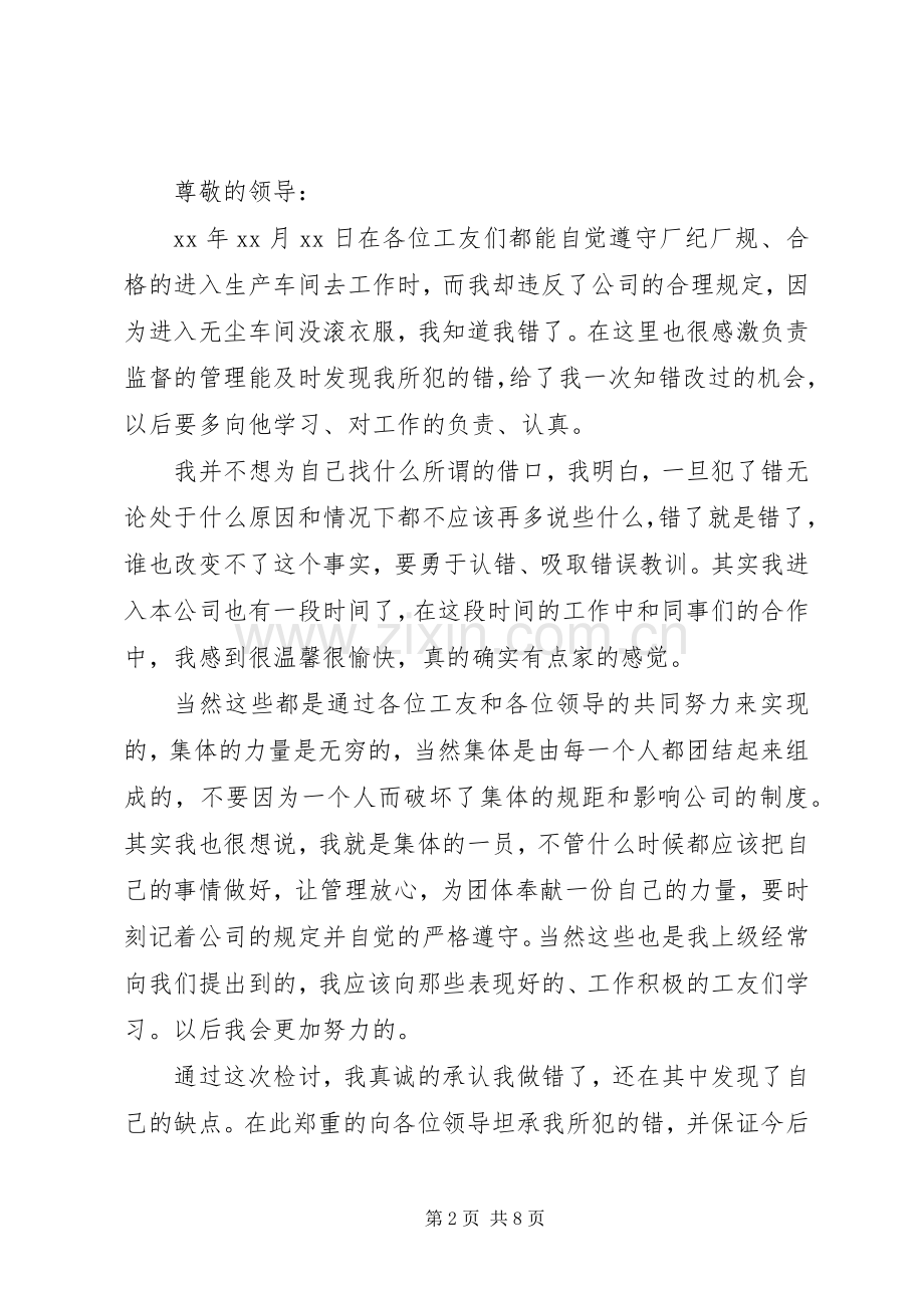 xx年xx月xx日在各位工友们都能自觉遵守厂纪厂规、合格的进入生产车间去工作时,而我却违反了公司的合理规定,因为进入无尘车间没滚衣服,我知道我错了。在这里也很感激负责监督的管理能及时发现我所犯的错,给了我一次知错改过的机会,以后要多向他学习、对工作的负责、认真。