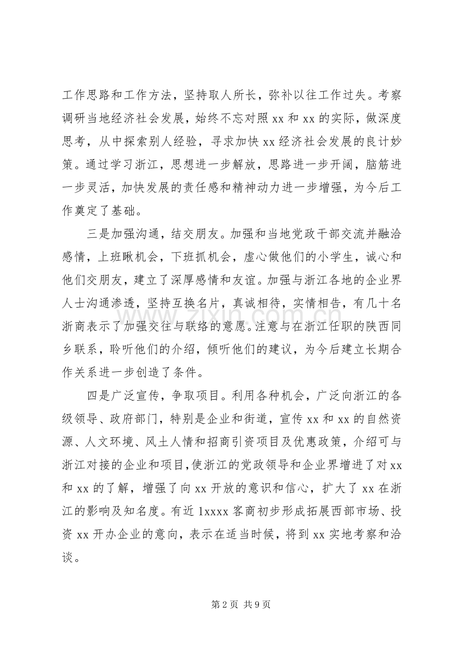 一是认真考察,虚心学习。除自觉参加有关会议,翻阅区情资料、文件和当地报刊,拜访领导外,坚持深入部门,深入街道,深入企业,调研了解xx区经济发展、改革开放、招商引资、社区建设、科教兴区及党政机关效能建设的基本情况和成功经验,同时多次赴周边区县和温州、金华、宁波、义乌等地考察,参观娃哈哈、ut斯达康、万向集团和天水街道办的几个社区。既对浙江地域文化所独有的创业精神及XX市以和谐创业为主题的发展理念进行了感受,又对浙江各地效能建设、招商引资、民营经济发展经验进行了学习,还对温州模式、义乌小商品市场、绍兴企业上市等热点进行了分析,从而基本掌握了浙江发展的真经。