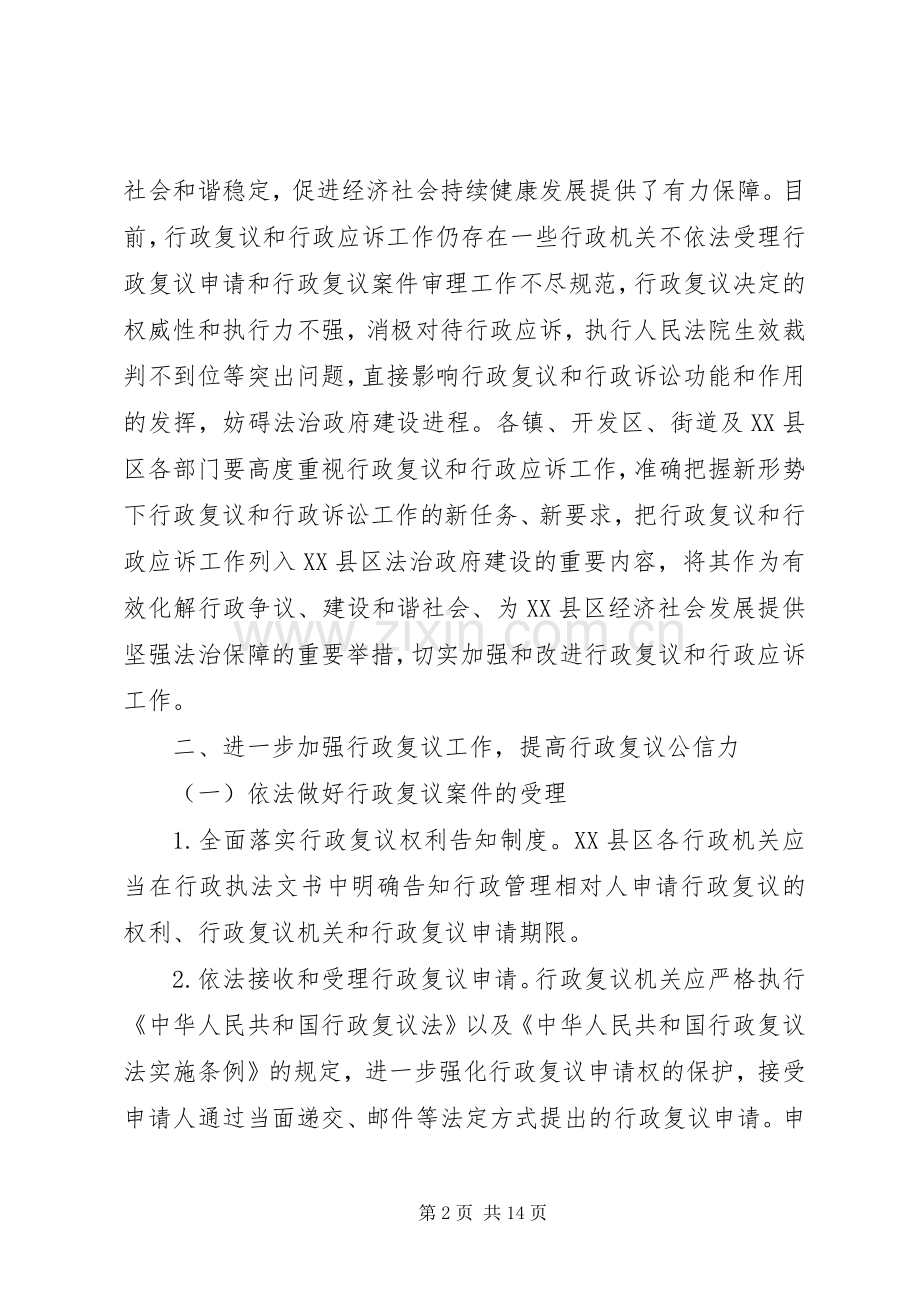 行政复议和行政诉讼是解决行政争议、化解社会矛盾,保护公民、法人和其他组织合法权益,健全行政权力运行制约和监督机制的重要法律制度。近年来,我XX县区各级行政机关深入推进法治政府建设,积极履行行政复议和行政应诉工作职责,为保护公民、法人和其他组织的合法权益,实现社会公平正义、维护社会和谐稳定,促进经济社会持续健康发展提供了有力保障。目前,行政复议和行政应诉工作仍存在一些行政机关不依法受理行政复议申请和行政复议案件审理工作不尽规范,行政复议决定的权威性和执行力不强,消极对待行政应诉,执行人民法院生效裁判不到位等突出问题,直接影响行政复议和行政诉讼功能和作用的发挥,妨碍法治政府建设进程。各镇、开发区、街道及XX县区各部门要高度重视行政复议和行政应诉工作,准确把握新形势下行政复议和行政诉讼工作的新任务、新要求,把行政复议和行政应诉工作列入XX县区法治政府建设的重要内容,将其作为有效化解行政争议、建设和谐社会、为XX县区经济社会发展提供坚强法治保障的重要举措,切实加强和改进行政复议和行政应诉工作。