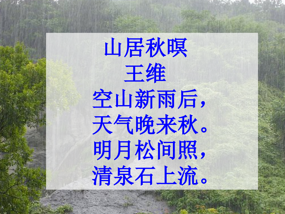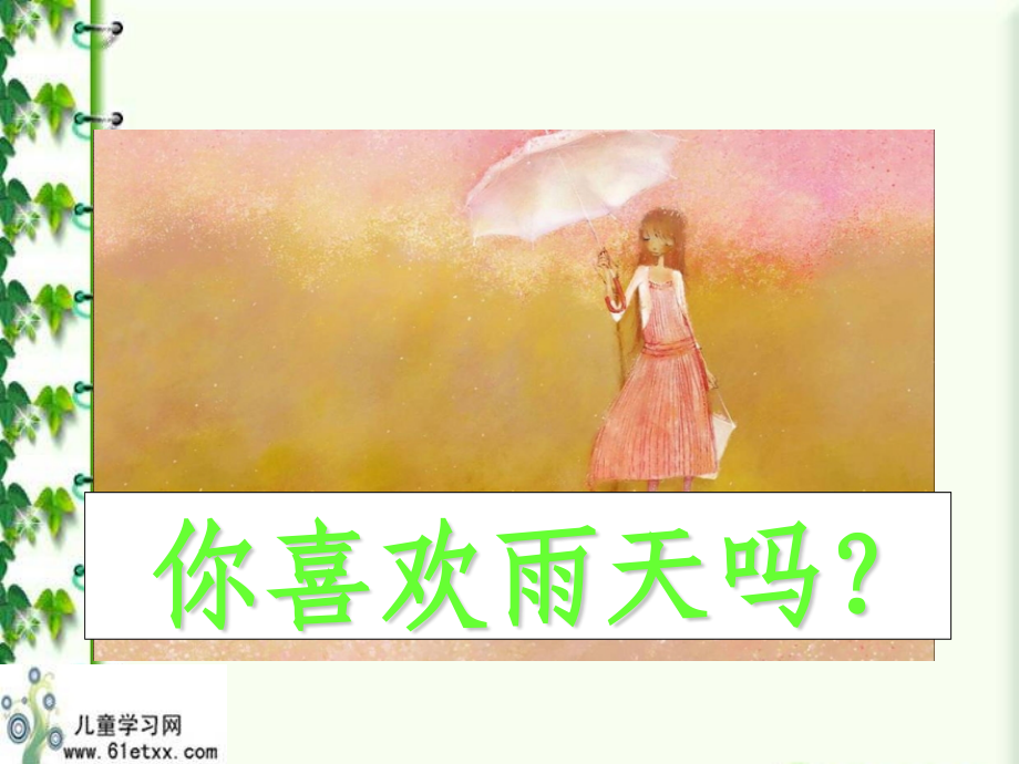 单击此处编辑母版标题样式,单击此处编辑母版文本样式,第二级,第三级,第四级,第五级,#,你喜欢雨天吗,?,山居秋暝,王维,空山新雨后,,天气晚来秋。,明月松间照,,清泉石上流。,山雨,教学目标:,、正确读记文中生词。,2、有感情的朗读课文,背诵自己喜欢的部分。,3、感受山雨的韵味,体会作者对山雨的喜爱,,领略大自然的秀美。,4、学习作者通过联想和想象来表达独特感受,的方法。,5、掌握文中的修辞手法和破折号的用法。,教学重难点:,、正确读记文中生词。,2、掌握文中的破折号的意义。,3、体会作者对山雨的喜爱。,初读课文,共同探讨:,1.,作者是按怎样的顺序把这场山雨介绍给我们的?,2.,这场山雨中,作者倾听到了什么,观察到了什么?用课文中的话来回答。,啼啭:,形容鸟婉转地叫。,湿润 轻盈 歌谣 神奇 清晰 飘飘洒洒 弹奏 优雅 辨认 融化 耀眼 啼啭 忘却 倾吐 欢悦 凝聚 清脆 余韵,轻盈:,一般是形容女子身材苗条,动作轻快。,初读课文,共同探讨:,1.,作者是按怎样的顺序把这场山雨介绍给我们的?,2.,这场山雨中,作者倾听到了什么,观察到了什么?用课文中的话来回答。,写雨的顺序,雨前,雨中,雨后,雨的两个方面,雨的声音(音韵美),雨的色彩(色彩美),破折号的作用,1.表示解释说明 2.表示语音的延长 3.表示意思的转换,跳跃或转折,4.表示插说 5.电脑应用 6.加强重点 7.分行举例 8.用在副标题前 9.标明作者,10.补充说明,11.表示总结上文 12.表示语言的延续,欣赏课文朗读,并想,作者听到了什么?观察到了什么?请用课文里的话回答。(播放),(先是听见山雨的声音,接着看到山雨改变了山林的颜色。),读读写山雨声音的句子,找出句子中的比喻部分并画出,体会作者的思想感情。,a沙啦啦,沙啦啦,b像一曲/无字的歌谣,神奇地/从四面八方飘然而起,逐渐/清晰起来,由远而近,由远而近,(,这里将,比作 从这奇特的想象中表达作者对山雨的 。,雨声,“无字的歌谣”,无比喜爱,作者用比喻的手法,描写了与来时雨声 由远及近,由轻及重的动态过程,与文章开头相对应,写出善于来世的特点,即“来得突然”“悄悄地来”。作者将雨声比作“无声的歌谣”。,突出雨来时一种逐渐清晰,飘飘渺渺的音韵美,表达了作者对山雨的独特情感,给人以无限遐想。,c雨声里,山中的每一块/岩石、每一片/树叶、每一丛/绿草,都变成了/奇妙无比的琴键。(这里作者把,、,、,比作,琴键,。),c,岩石,树叶,绿草,岩石,树叶,绿草,d,飘飘洒洒的雨丝,/,是无数轻捷柔软的手指,弹奏出,/,一首又一首优雅的小曲,每一个音符,/,都带着幻想的色彩。,作者将,比作,,把,比作,。,洒落的雨丝,“轻捷柔软的手指”,雨声,“优雅的小曲”,小结:作者通过大胆而又奇特的想象,写出了山雨的音乐美,表达了作者对山雨的喜爱之情。同时也带给我们一个广大的想象空间,引起我们产生无限美好的遐想。,下面该感悟山雨中的色彩美。,下面该感悟山雨中的 美,美得,不,得 了,色彩,读读写雨色彩的句子,你体会到了什么?,在雨中,所有的色彩都融化在水淋淋的嫩绿之中,绿得耀眼,绿得透明。,(这里实写雨的色彩,,给人清新的感觉。),绿,这清新的绿色仿佛在雨雾中流动,流进我的眼睛,流进我的心胸。(这是作者对雨色的,)因为作者发自内心地喜爱这绿色,所以讲“流进我的心胸”。,想象,这篇课文是按怎样的顺序来写的?(),这场山雨是在人们不知道的情况下,悄悄地、悄悄地来,于是山林中演奏出一首又一首优雅的小曲。随着这优美动听的声音,雨,改变了山林的颜色,绿得耀眼,绿得透明。而后,它又悄悄地、悄悄地走了,只留下了它的余韵。,雨前、雨中、雨后,(,4,),雨中山林美景:清新的绿色,流动的绿色,山雨,这篇散文,是按,_,、,_,、,_,的顺序来写的,作者通过合理而新奇的,_,和,_,,并运用,_,、,_,等修辞手法,描绘出山雨带来的,_,美和,_,美,表达了作者对山雨的,_,之情。,雨前,雨中,雨后,联想,想象,比喻,拟人,声音,色彩,喜爱,记忆宛,若一张干燥的宣纸,这绿,随着丝丝缕缕的微雨,悄然,在纸上化开,化开。,雨中的绿非同一般,给作者的印象也格外深,从而使记忆变得鲜活,而具有灵性。,那么你眼中的雨又是怎样的呢?用几句话写下来吧!可以用自己的话写,也可以摘抄课文中和课外你收集的语句。,1、,秋雨如烟如雾,无声地飘洒在那空地上的瓦砾堆里、枯枝败叶上,淋湿了地,淋湿了房,淋湿了树。,2、雨水洒下来,各种花草的叶子上都凝结着一颗颗晶莹的水珠。,3、雨如万条银丝从天上飘下来,屋檐落下一排排水滴,像美丽的珠帘。,4、窗外下着蒙蒙细雨,滴滴的小雨点,好像伴奏着一支小舞曲,我不禁被窗外的世界所诱惑。,5、雨珠顺着小草的茎滚下来,一滴钻到土里,又一滴钻到了小草的嘴里,找不到了。,6、雨点儿落在我的头上、身上,我仰面向上,闭着眼,张着口品着那点点雨珠,顿时,我觉得自己仿佛在细雨的浇灌下又长了许多。,7、雷声响过,大雨就像断了线的珠子一样不断地往下落。,1、雨从空中洒向各个角落,雨滴很像一颗颗晶莹透明的珍珠,好看极了。雨滴从屋檐、墙头、树叶上跌下,就如同断了线的珠子一样,最后连在一起,形成水柱。,2、风呼呼地刮着,雨哗哗地下着。近看,街道上连一个人影也没有,白白花的全是水,简直成了一条流淌的河,上面争先恐后地开放着无数的水花;远看,楼房和树木都是模模糊糊的。,3、风夹着雨点,像在地上寻找什么似的,东一