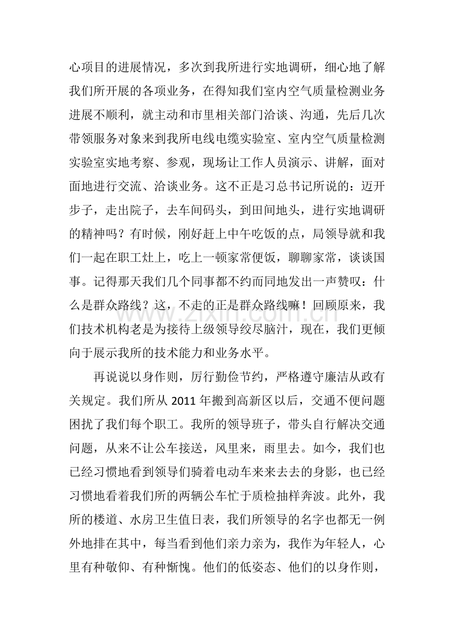 首先,形式主义少了,务实多了。给我感触最深的就是各级领导出现在我们基层技术机构的频率变多了,而且,站在试验台旁的时间变长了。自从我所开展了电线电缆、电器开关新项目后,得到了市局领导的高度重视,局领导十分关心项目的进展情况,多次到我所进行实地调研,细心地了解我们所开展的各项业务,在得知我们室内空气质量检测业务进展不顺利,就主动和市里相关部门洽谈、沟通,先后几次带领服务对象来到我所电线电缆实验室、室内空气质量检测实验室实地考察、参观,现场让工作人员演示、讲解,面对面地进行交流、洽谈业务。这不正是习总书记所说的:迈开步子,走出院子,去车间码头,到田间地头,进行实地调研的精神吗?有时候,刚好赶上中午吃饭的点,局领导就和我们一起在职工灶上,吃上一顿家常便饭,聊聊家常,谈谈国事。记得那天我们几个同事都不约而同地发出一声赞叹:什么是群众路线?这,不走的正是群众路线嘛!回顾原来,我们技术机构老是为接待上级领导绞尽脑汁,现在,我们更倾向于展示我所的技术能力和业务水平。