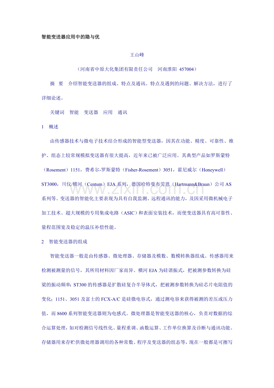 摘 要 介绍智能变送器的组成、特点及通讯。特点及遇到的问题、解决方法,进行了详细论述。