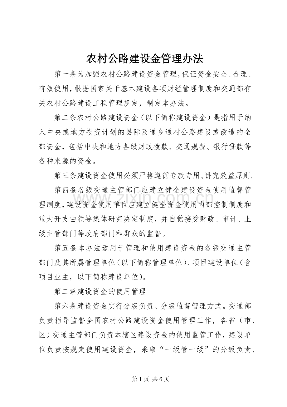 第一条为加强农村公路建设资金管理,保证资金安全、合理、有效使用,根据国家关于基本建设各项财经管理制度和交通部有关农村公路建设工程管理规定,制定本办法。