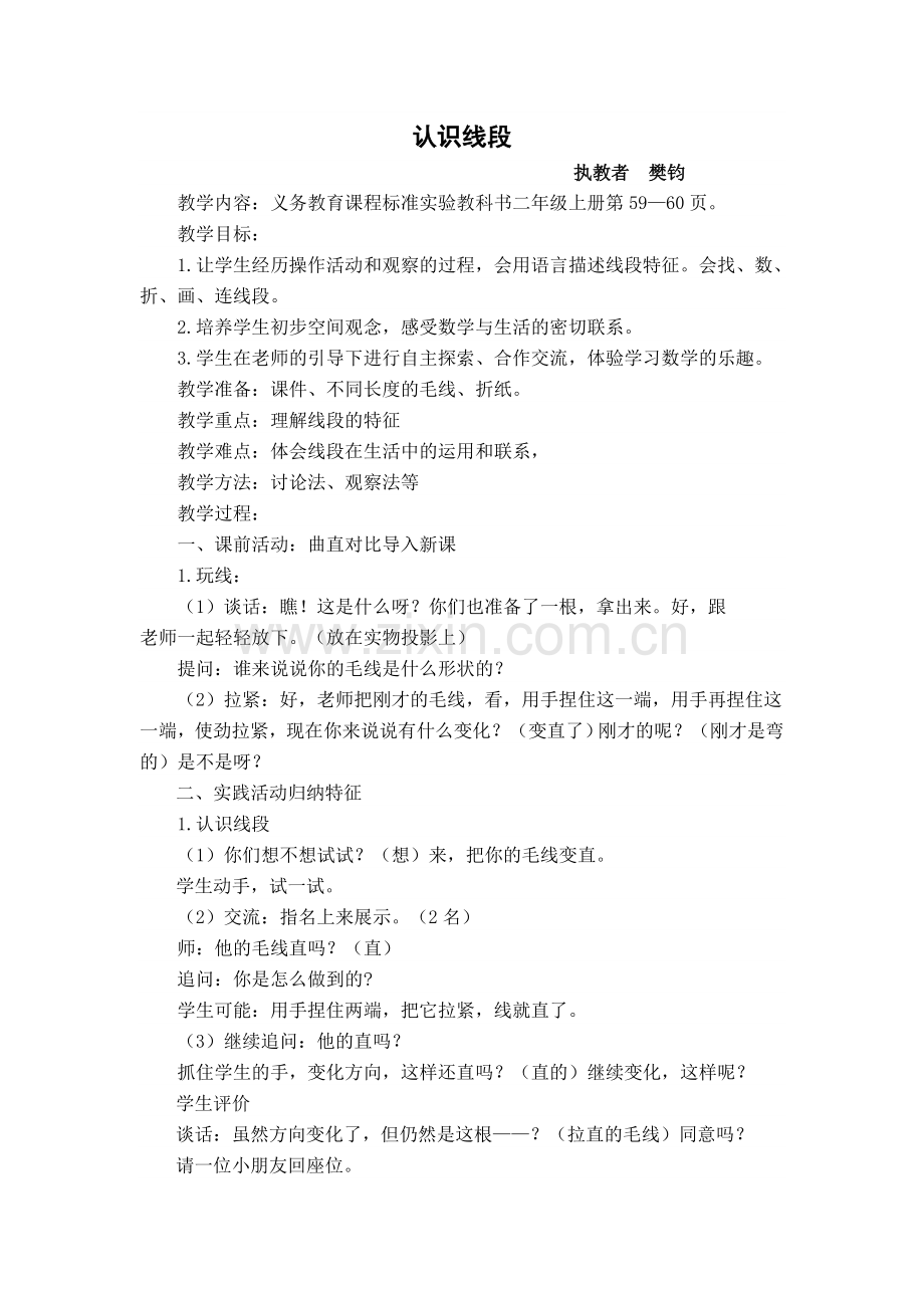 教学反思:线段对二年级学生来说是比较抽象的。教材注重学生的体验,在体验的基础之上通过大量表象的支持,从而获得对线段特征的直观认识。在教学过程中,我注重让学生经历认识线段的活动过程,注重培养学生的初步实践能力和想象力,充分感受生活与数学的密切联系。