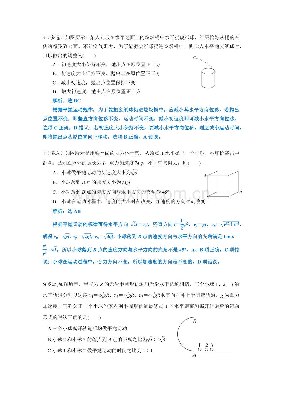 3(多选)如图所示,某人向放在水平地面上的垃圾桶中水平扔废纸球,结果恰好从桶的右侧边缘飞到地面。不计空气阻力,为了能把废纸球扔进垃圾桶中,则此人水平抛废纸球时,可以做出的调整为( )