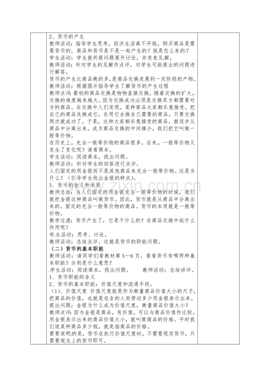 教师活动:指导学生思考,经济生活离不开钱,购买商品是需要货币的,商品和货币是不是一起产生的?钱是怎么来的?