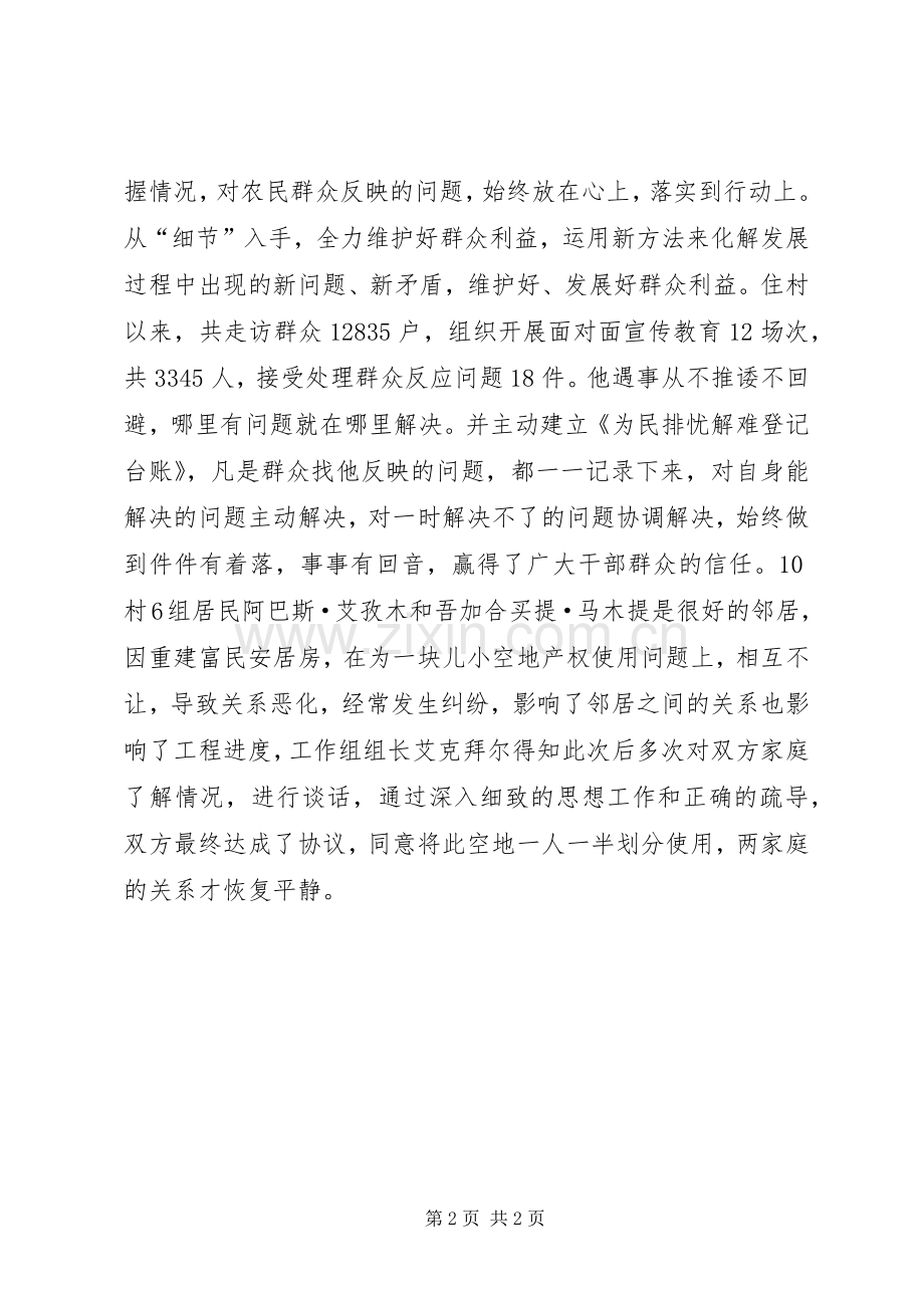 二、抓矛盾,重走访,切实做到为民服务。自“三民”活动开展以来,艾克拜尔·买买提同志严格按照活动要求,坚持深入群众与群众唠家常、谈村事、讲政策、论发展、询诉求、了解掌握情况,对农民群众反映的问题,始终放在心上,落实到行动上。从“细节”入手,全力维护好群众利益,运用新方法来化解发展过程中出现的新问题、新矛盾,维护好、发展好群众利益。住村以来,共走访群众12835户,组织开展面对面宣传教育12场次,共3345人,接受处理群众反应问题18件。他遇事从不推诿不回避,哪里有问题就在哪里解决。并主动建立《为民排忧解难登记台账》,凡是群众找他反映的问题,都一一记录下来,对自身能解决的问题主动解决,对一时解决不了的问题协调解决,始终做到件件有着落,事事有回音,赢得了广大干部群众的信任。10村6组居民阿巴斯·艾孜木和吾加合买提·马木提是很好的邻居,因重建富民安居房,在为一块儿小空地产权使用问题上,相互不让,导致关系恶化,经常发生纠纷,影响了邻居之间的关系也影响了工程进度,工作组组长艾克拜尔得知此次后多次对双方家庭了解情况,进行谈话,通过深入细致的思想工作和正确的疏导,双方最终达成了协议,同意将此空地一人一半划分使用,两家庭的关系才恢复平静。