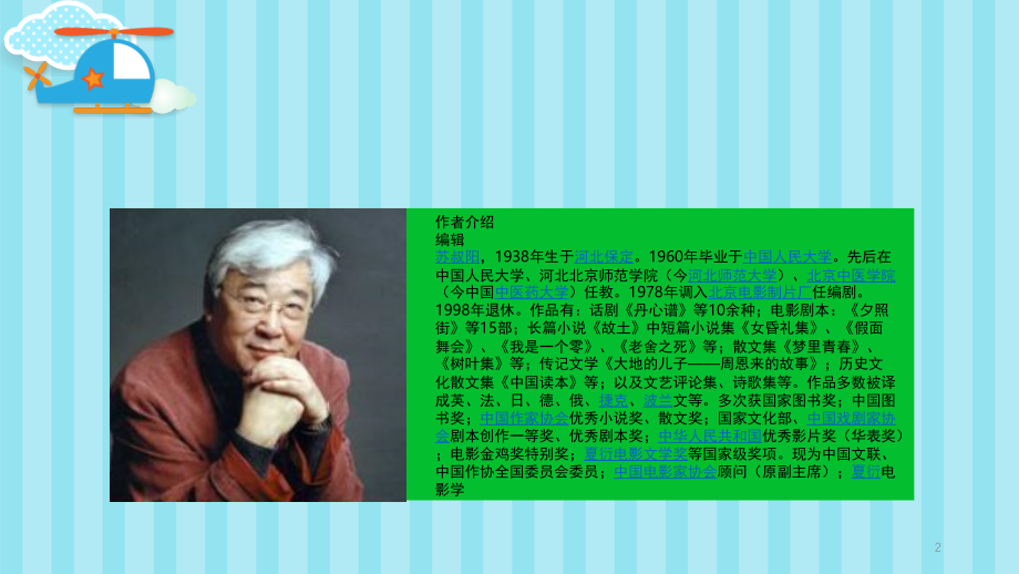 单击此处编辑母版标题样式,编辑母版文本样式,第二级,第三级,第四级,第五级,*,*,单击此处编辑母版标题样式,编辑母版文本样式,第二级,第三级,第四级,第五级,*,*,读书,分享会,1,作者介绍,编辑,苏叔阳,,,1938,年生于,河北保定,。,1960,年毕业于,中国人民大学,。先后在中国人民大学、河北北京师范学院(今,河北师范大学,)、,北京中医学院,(今中国,中医药大学,)任教。,1978,年调入,北京电影制片厂,任编剧。,1998,年退休。作品有:话剧,丹心谱,等,10,余种;电影剧本:,夕照街,等,15,部;长篇小说,故土,中短篇小说集,女昏礼集,、,假面舞会,、,我是一个零,、,老舍之死,等;散文集,梦里青春,、,树叶集,等;传记文学,大地的儿子,周恩来的故事,;历史文化散文集,中国读本,等;以及文艺评论集、诗歌集等。作品多数被译成英、法、日、德、俄、,捷克,、,波兰,文等。多次获国家图书奖;中国图书奖;,中国作家协会,优秀小说奖、散文奖;国家文化部、,中国戏剧家协会,剧本创作一等奖、优秀剧本奖;,中华人民共和国,优秀影片奖(华表奖);电影金鸡奖特别奖;,夏衍电影文学奖,等国家级奖项。现为中国文联、中国作协全国委员会委员;,中国电影家协会,顾问(原副主席);,夏衍,电影学,2,1,6,4,第一章 我们的祖国叫中国,我们的母亲叫中国,5,2,3,8,0,7,第七章 我们向世界奉献了无数的发明创造,第八章 我们最懂得美,最会创造美,1,2,11,9,第九章 我们有优秀的军事文化,第十一章 我们有自己悠久独特的生活方式,第十二章 我们有无限光明的未来,第六章 我们有古老而又智慧的宇宙观,优秀的传统伦理和道德,第五章 我们有最古老而又最具生命力的文字,第四章 我们有悠久灿烂的历史,第三章 我们有众多的兄弟,第二章 我们有广阔的彊土,第十章 我们有生命力强大的经济文化,3,我们的母亲叫中国,图书隶属,百年百部中国儿童文学经典书系,。是有史以来中国儿童文学最大规模的系统梳理总结。作者是苏叔阳,全书共十二章,内容包括祖国的自然史、朝代史、地理地貌、气候、物产、民族构成、语言文字、政治制度、经济发展、军事文明、科学技术、思想学术、文学艺术、伦理道德、生活方式、习俗人情等等,表达了作者对我们伟大的祖国、对源远流长的中华文化、对光荣的先辈的深深的爱。,简介,4,第一章,我们的祖国叫中国,5,1.,我们的祖国名字叫中国,历史上又曾以华夏来称呼我们的祖国。,2.,黄帝本姓公孙,后改姓姬,名轩辕。他的妻子叫嫘祖,发明了养蚕缫丝、织染成绸,做成衣服。(嫘li、缫so),我们的祖国叫中国,6,第二章,我们有广阔的彊土,7,我们有广阔的彊土,我国疆土的形成,1.,我国领土面积约,960,万平方公里,几乎和欧洲相等。,2,、我国疆域宽广,海域辽阔,东西长约,5200,公里,南北相距约,5500,公里。我国疆土的最北端是黑龙江省漠河以北黑龙江主航道的中心线;最南点是南沙群岛的曾母暗沙;最东端是黑龙江和乌苏里江的主航道汇合处;最西端位于帕米尔高原上。,我们的疆土地形交错、壮丽,1.,我们的疆土有多种地形,巍巍的群山、冷峻的高原,巨大的盆地、起伏的丘陵和一望无际的平原。我国的地势是西高东低。,2,、青藏高原是世界上最高的大高原,号称“世界屋脊”,是世界最高峰。,3,、内蒙古高原是我国的第二大高原,它与黄土高原、云贵高原、青藏高原号称我国的“四大高原”。,4,、三大盆地,分别是塔里木盆地、准噶尔盆地、四川盆地。塔里木盆地是世界上最大的内陆盆地,盆地中央是我国最大的塔克拉玛干沙漠。准噶尔盆地是我们的“聚宝盆”,四川盆地是我们的“天府之国”。,5,、吐鲁番盆地自古被称为“火州”,盆地中央的艾丁湖湖面比海平面低,155,米,是我国陆地的最低点。,6,、我国的三大平原:东北平原、华北平原、长江中下游平原。,7,、我们的祖国是一个多山的国家,山区面积占全国总面积三分之二以上。,复杂多样的气候,1,、我国的气候复杂多样,北部靠近寒带,黑龙江省北部,长冬无夏;南部地处热带,海南岛地区长夏无冬;而我国大部分地区则处在温带,四季分明。,2,、民谣“早穿皮袄午穿纱,抱着火炉吃西瓜”是形容我国西北部内陆地区寒暑变化显著。,3,、塔里木盆地边缘的年降水量不足,10,毫米,是我国最干旱的地区;台湾的火烧寮平均年降水量在,6000,毫米以上,是我国平均年降水量最多的地方。,我们有众多江河、湖泊,注入大洋的河流称为外流河;消失在沙漠里,或是静悄悄流入内陆湖泊里的河流叫做内流河(内陆河)。我国江河大多自西向东,奔流入海。向东注入太平洋的有:长江、黄河、黑龙江、珠江等;向南注入印度洋的有:雅鲁藏布江、怒江等;向北注入北冰洋的只有额尔齐斯河。新疆的塔里木河是我国最大的内流河。,8,我们有广阔的彊土,我们美丽的景色举世无匹,我们有多,种多样珍,奇的植物,我们有数不清的珍禽异兽,植,景,1,、银杏、银杉(“植物熊猫”“冰川元老”)、水杉、珙桐(“中国鸽子树”)、杜仲、喜树、观光木、红桧树,2,、“三大名花”杜鹃花、报春花、龙胆花;“花中之王”牡丹,1,、名山长白山、“五岳”、黄山(“四绝”)、庐山、峨眉山,2,、美丽的“绿宝石”西双版纳;“山水甲天下”桂林、阳朔;“天堂”苏州、杭州,3,、台湾的日月潭、阿里山;北京的长城、天坛,。,我们有多姿多彩的海岸,我们有丰富的矿藏,海,矿,兽,1,、我国东部面临着世界