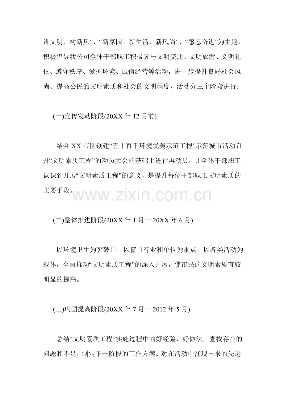 为提升文明素质,培育文明精神,倡导文明行为,弘扬文明新风,争创文明城市,根据XX市“全民素质工程”、市文明委“文明素质工程”实施和市住房和城乡规划建设局关于开展“文明素质工程”的实施方案要求,结合我公司精神文明建设工作目标,特制定本实施方案。