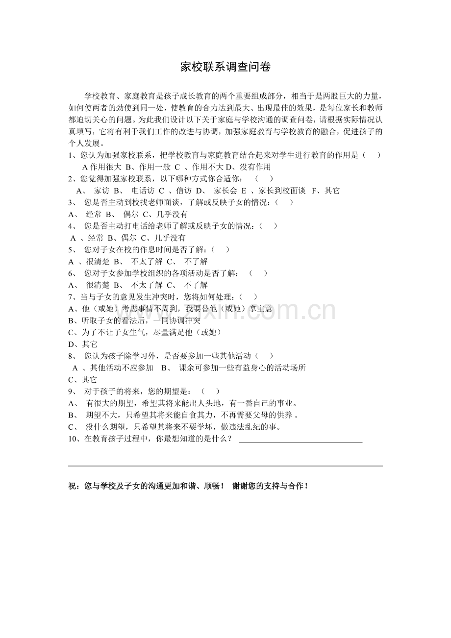 学校教育、家庭教育是孩子成长教育的两个重要组成部分,相当于是两股巨大的力量,如何使两者的劲使到同一处,使教育的合力达到最大、出现最佳的效果,是每位家长和教师都迫切关心的问题。为此我们设计以下关于家庭与学校沟通的调查问卷,请根据实际情况认真填写,它将有利于我们工作的改进与协调,加强家庭教育与学校教育的融合,促进孩子的个人发展。