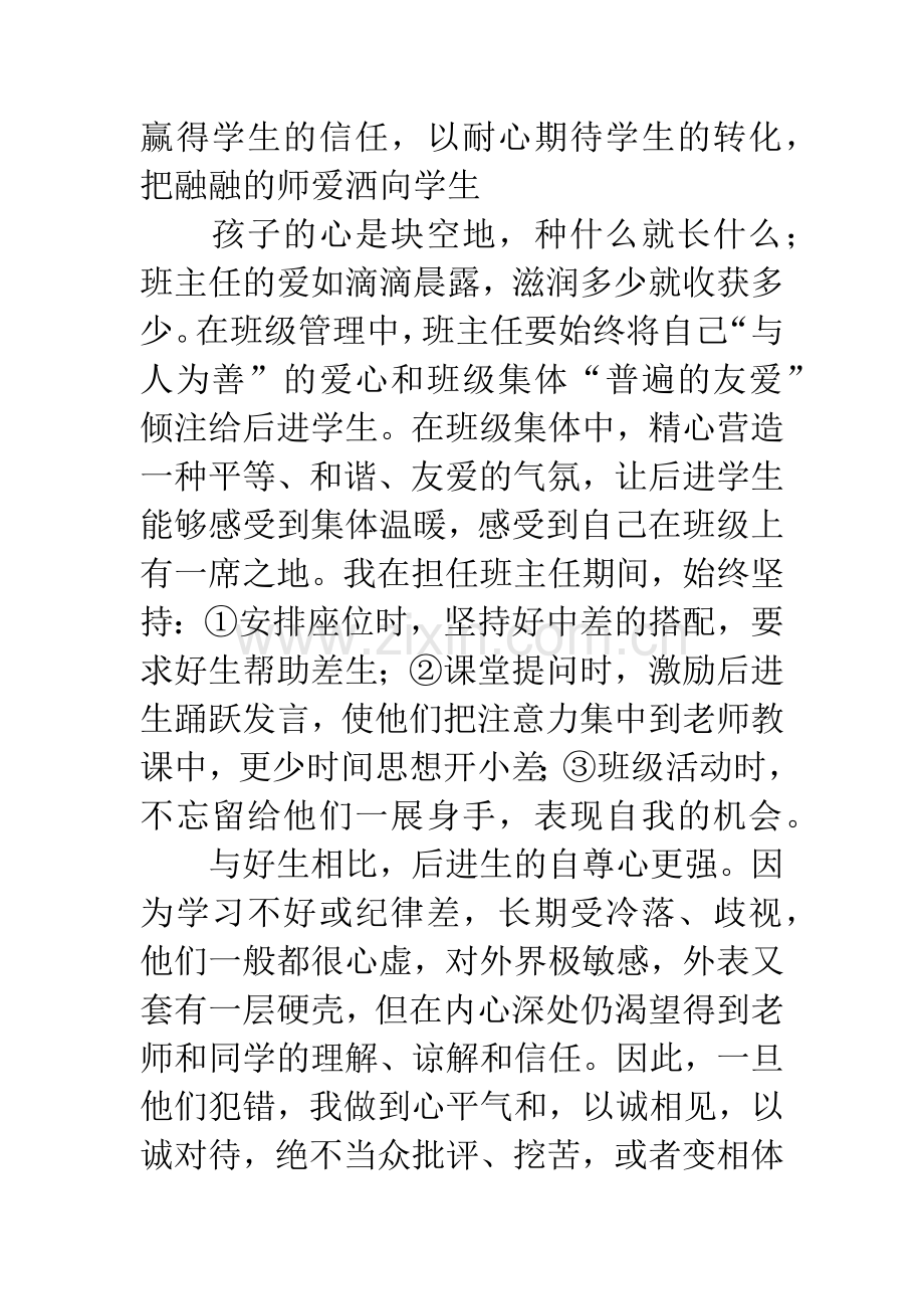后进生意志薄弱,自控力差,行为极易反复无常,所以做后进生的思想工作不要简单地认为通过一次谈心,他们就能彻底改好。出现反复时,我坚持做细致的工作,做到防微杜渐。后进生虽然有很多不足之处,但即使再差的学生也总有某方面的特长或优势,比如班级学生杨x x学习差,但他在体育、美术方面特长,我捕捉到他身上的闪光点,发掘其身上的潜能,充分肯定,积极评价,使该学生的进取之火燃得更旺,使他找回自我,学习进步突飞猛进。我深刻体会到作为从事教育工作着,应该对后进学生多一份爱、少一份斥责,一定会取得好的收效。在我的带领下,全班学生互助互爱,互相学习,学习成绩年级前茅。