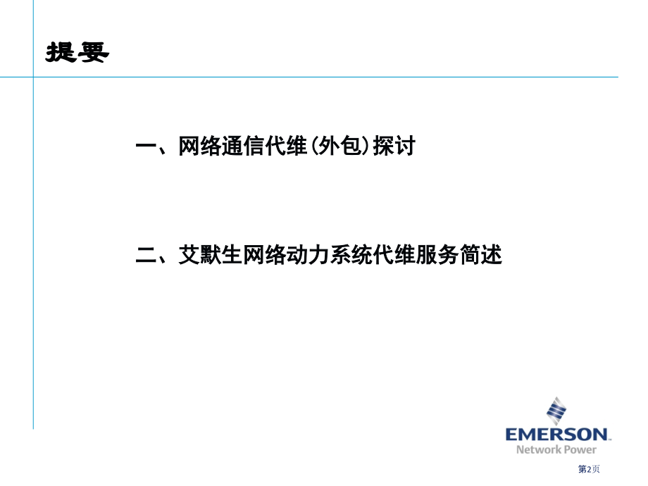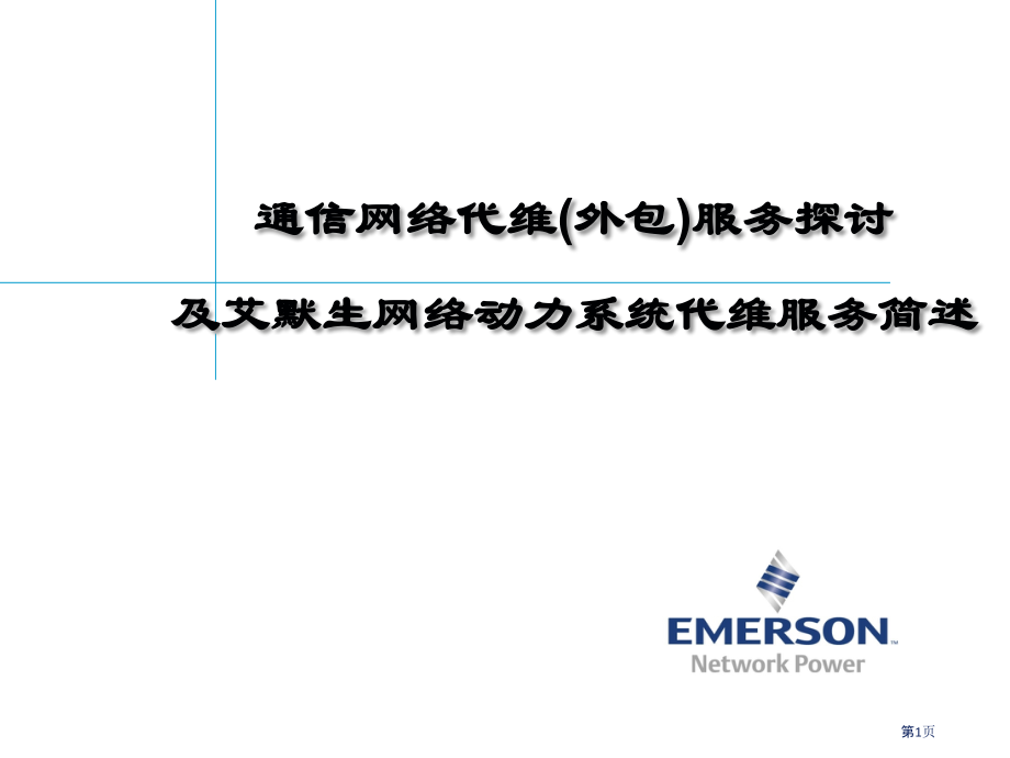 Click to edit Master title style,Click to edit Master text styles,Second level,Third level,Fourth level,Fifth level,*,*,Click to edit Master title style,*,Click to edit Master text styles,Second level,Third level,Fourth level,Fifth level,Click to edit Master title style,Click to edit Master text styles,Second level,Third level,Fourth level,Fifth level,*,Click to edit Master title style,Click to edit Master text styles,Second level,Third level,Fourth level,Fifth level,*,Click to edit Master title style,Click to edit Master text styles,Second level,Third level,Fourth level,Fifth level,*,Click to edit Master title style,Click to edit Master text styles,Second level,Third level,Fourth level,Fifth level,*,Click to edit Master title style,Click to edit Master text styles,Second level,Third level,Fourth level,Fifth level,*,Click to edit Master title style,Click to edit Master text styles,Second level,Third level,Fourth level,Fifth level,*,Click to edit Master title style,Click to edit Master text styles,Second level,Third level,Fourth level,Fifth level,*,Click to edit Master title style,Click to edit Master text styles,Second level,Third level,Fourth level,Fifth level,*,Click to edit Master title style,Click to edit Master text styles,Second level,Third level,Fourth level,Fifth level,*,Click to edit Master title style,Click to edit Master text styles,Second level,Third level,Fourth level,Fifth level,*,Click to edit Master title style,Click to edit Master text styles,Second level,Third level,Fourth level,Fifth level,*,Click to edit Master title style,Click to edit Master text styles,Second level,Third level,Fourth level,Fifth level,*,Click to edit Master title style,Click to edit Master text styles,Second level,Third level,Fourth level,Fifth level,*,Click to edit Master title style,Click to edit Master text styles,Second level,Third level,Fourth level,Fifth level,*,Click to edit Master title style,Click to edit Master text styles,Second level,Third level,Fourth level,Fifth level,*,Click to edit Master title style,Click to edit Master text styles,Second level,Third level,Fourth level,Fifth level,*,Click to edit Master title style,Click to edit Master text styles,Second level,Third level,Fourth level,Fifth level,*,通信网络代维,(,外包,),服务探讨,及艾默生网络动力系统代维服务简述,第1页,提要,一、网络通信代维,(,外包,),探讨,二、艾默生网络动力系统代维服务简述,第2页,关于通信网络代维,(,外包,),服务综述,网络通信运维服务演变,网络通信代维,(,外包,),服务需求分析,成本与质量关联度,资源与质量依存度,网络通信代维,(,外包,),服务实施模式,网络通信代维,(,外包,),服务实施要素,第3页,通信网络运维服务演变趋势,备件与培,训需求,基础维护,与维修需求,业务分层,代维需求,整体外包,/,代维需求,发展路径,技术壁垒,驱动原因,技术跟随,与资源瓶颈,效益导向,与组织优化,运行创新与,转型能力构建,从被动到主动,催生代维,(,外包,),需求,第4页,运作特征,:,决定资源配置数量和运行模式,计划性:外包性有规模成本优势。,分散性:外包成本控制困难,成本发生在非现场。,突发性:外包实现冗余资源供享降低成本。,质量要求,:,决定资源能力和基础管理能力要求,安全性:外包增加安全控制难度。,规范性:外包承接者专业程度需要确保。,及时性:外包更有利控制。,可控制程度,:,决定管理改进压力与方向,不可预测性:经典不具备外包性特征。,风险性:风险转移困难妨碍深层次外包。,成本质量矛盾:衡量投入产出困难。,技术复杂性与改变:外包与自主管理都有难度。,运作特征,决定成本,质量要求,影响控制性,可控制性,决定,管理复杂度,通信网络运维代维,(,外包,),分析,业务特征,第5页,网络规模快速扩张造成资源瓶颈,人均效益压力造成资源紧缩政策,资源能力与业务需求匹配性难以协调,技术更新过快造成运维技术更新压力与跟随困难,能用更低成本业务模式成为最正确选择,降低人力资源和行政管理复杂度,流程外部化,降低内部监控执行复杂度,关键要素:,质量,及,成本,关联度,资源,及,技术,依存度,通信网络运维代维,(,外包,),需求要素,第6页,质量,成本,质量极限,动态成本约束线,最低质量约束,最优质量成本:,质量与成本能够动态优化,而风险区间能够用最低成本屏蔽。,无风险理想质量成本线,最低成本线,预期质量成本最优,成本控制压力,动态质量约束线,理想质量成本最优,成本增加,风险增加,质量改进压力,改进,创新压力,普通外包目标是成本降低,但前提是质量(产品质量、速度、效率等)标准固定。,在存在质量提升要求领域,需要动态管理质量于成本,如网络运行维护领域,。,通信网络运维代维,(,外包,),分析,质量与成本,第7页,通信网络运维代维,(,外包,),分析,资源与技术依存度,技术依存度,资源依存度,100%,100%,0,专业类整体外包,业务分层外包,成本与管理压力高强度,部分业务外包或服务采购,实质上需求框架是一个多维系统而非二维平面。,这里只是抽象出来最基本原因分析。,模式外包,第8页,附:关键要素对外依存度评定表,技术要素,对外依存度,资源要素,对外依存度,(,%,),(,%,),产品技术,自有资源率,技术取得,内部资源取得性,知识更新,外部资源取得性,技术积累,资源调度程序,跨专业技能,资源流动性,教授流动性,资源冗余度,人员可替换性,资源层级结构,技术层级结构,资源缺失风险,技术缺失风险,综合评定,综合评定,第9页,通信网络运维代维,(,外包,),实施模式,业务分层外包,业务分层外包:,资源依赖程度较高;但技术无瓶颈;,资源要求不高,进入门槛低,市场竞争充分,低价中标