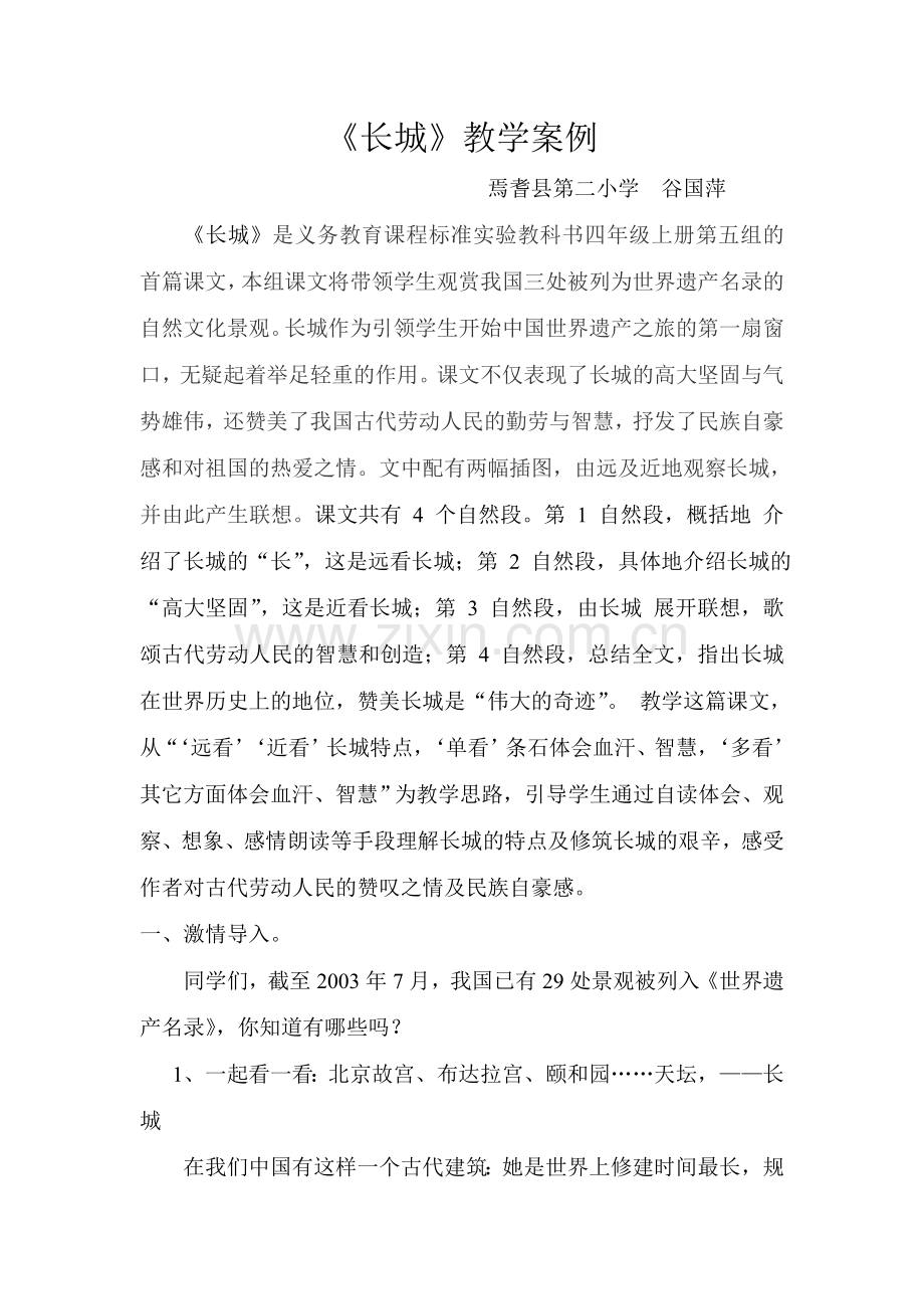 《长城》是义务教育课程标准实验教科书四年级上册第五组的首篇课文,本组课文将带领学生观赏我国三处被列为世界遗产名录的自然文化景观。长城作为引领学生开始中国世界遗产之旅的第一扇窗口,无疑起着举足轻重的作用。课文不仅表现了长城的高大坚固与气势雄伟,还赞美了我国古代劳动人民的勤劳与智慧,抒发了民族自豪感和对祖国的热爱之情。文中配有两幅插图,由远及近地观察长城,并由此产生联想。课文共有 4 个自然段。第 1 自然段,概括地 介绍了长城的“长”,这是远看长城;第 2 自然段,具体地介绍长城的“高大坚固”,这是近看长城;第 3 自然段,由长城 展开联想,歌颂古代劳动人民的智慧和创造;第 4 自然段,总结全文,指出长城在世界历史上的地位,赞美长城是“伟大的奇迹”。 教学这篇课文,从“‘远看’‘近看’长城特点,‘单看’条石体会血汗、智慧,‘多看’ 其它方面体会血汗、智慧”为教学思路,引导学生通过自读体会、观察、想象、感情朗读等手段理解长城的特点及修筑长城的艰辛,感受 作者对古代劳动人民的赞叹之情及民族自豪感。