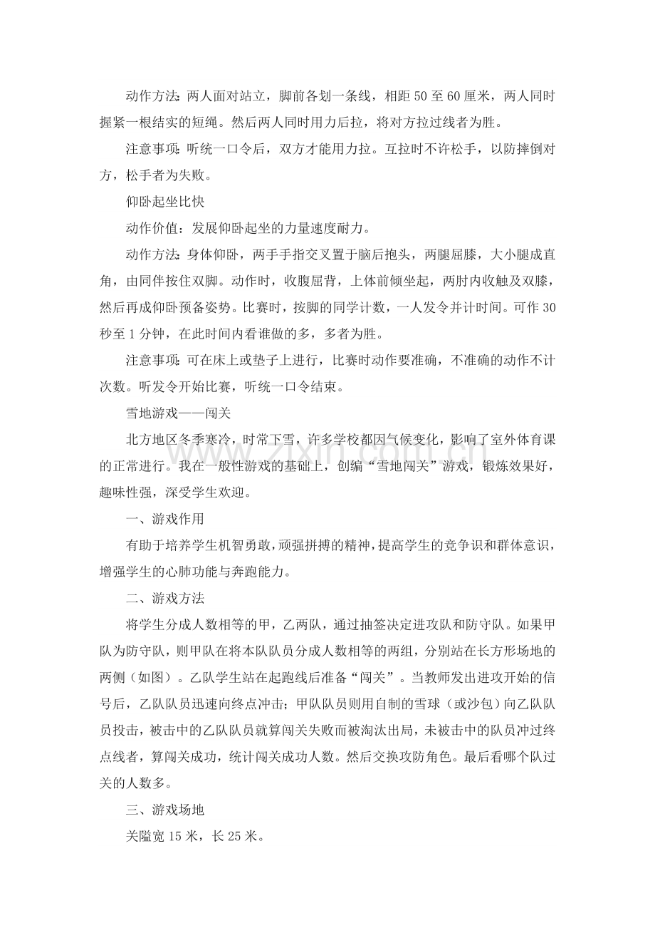 北方地区冬季寒冷,时常下雪,许多学校都因气候变化,影响了室外体育课的正常进行。我在一般性游戏的基础上,创编“雪地闯关”游戏,锻炼效果好,趣味性强,深受学生欢迎。