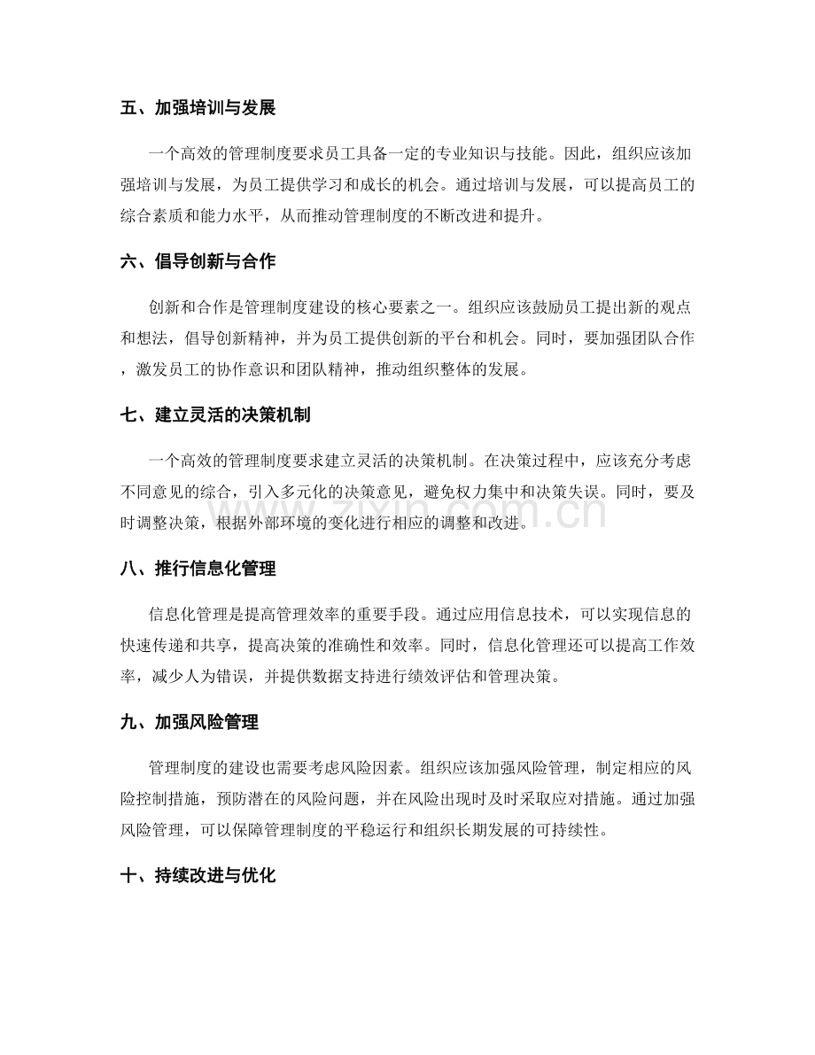 总结起来,建立一套高效的管理制度需要多个方面的考虑。明确目标与价值观、设立明确的工作流程、建立有效的沟通渠道、建立健全的绩效考核机制、加强培训与发展、倡导创新与合作、建立灵活的决策机制、推行信息化管理、加强风险管理以及持续改进与优化都是建立高效管理制度的重要环节。通过这些措施的实施,可以提高组织的工作效率和竞争力,实现可持续发展的目标。