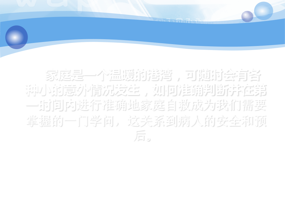,*,单击此处编辑母版标题样式,单击此处编辑母版文本样式,第二级,第三级,第四级,第五级,家庭意外急救与自救,家庭是一个温暖的港湾,可随时会有各种小的意外情况发生,如何准确判断并在第一时间内,进行准确地家庭自救成为我们需要掌握的一门学问,这关系到病人的安全和预后,。,家庭自救六忌,忌惊慌失措,忌随意搬动,忌舍近求远,忌一律平卧,忌胡乱处理,忌乱服药物,怎样呼叫救护车,一旦遇到急危重症,一定要及时向急救中心发出呼救,请有抢救经验的医生到现场进行抢救和转运,才能使急危重症患者得到及时有效的处置和安全运送。,呼救号码,“,120,”,口齿清楚,简明扼要,120,呼救内容,讲清患者当前最危急的病况表现;,原有的患病史;,讲清患者发病现场的详细地址,最好有明显建筑标志物;,留下电话号码,以便调度人员再联系,证实呼救的准确性。,当突发急、危、重病时,或发生意外事故受伤时,在打通急救电话、呼叫救护车后,在病人身边的其他人员应该做些什么呢?,现场,急救,应采取的初步措施:,1.,初步,检查,病人,神志、呼吸、血压、脉搏,等生命体征,并随时观察它们的变化,,5,分钟观察一次,。,2.,必须保持病人的正确,体位,,切勿随便推动或搬运病人,以免病情加重。,昏迷,病人发生呕吐时头侧向一边;,脑外伤、昏迷,病人不要抱着头乱晃;,高空坠落伤者,不要随便搬头抱脚移动;,哮喘,发作时若呼吸困难,病人应取半卧位,。,3.,清理楼道、走廊,移除影响搬运病人的杂物,方便急救人员和担架的快速通行。,4.,待救护车到达后,应向急救人员详细地讲述病人的病情、伤情以及发展过程、采取初步急救措施,以保证急救的连续性和完整性。,冠心病、心肌梗塞病人家庭自救,心脏的解剖,心脏是靠冠状动脉进行跳动的,整个心脏是个肌肉的袋子,当心脏收缩一次后,就会传送血液至肺与全身,将能源供给给心脏的就是冠状动脉,当由于某些原因使冠状动脉狭窄或完全闭塞导致其支配的心肌急性缺血、缺氧,则称为冠状动脉心脏病,甚至发生坏死,从而引起心律失常或停跳时,就称之为心肌梗塞。,哪些人容易罹患冠心病?,冠心病常伴发于糖尿病、高血脂、高血压者,吃得多、动的少,肥胖者,精神压力大、过度疲劳,现代人生活节奏快,过去认为冠心病是中老年人的“专利”,但现在年轻人也冠心病的侵袭对象,心肌梗塞的判断,主要症状,心前区突然持续性剧烈疼痛,面色苍白,出冷汗,烦躁不安、乏力、甚至昏厥。,心肌梗塞的判断,诱因,过度疲劳,情绪激动,突然用力(便秘),饱餐(饮酒)后,睡眠差或持续紧张工作等。,心肌梗塞的判断,发作先兆,胸闷,心慌,心前区疼痛,恐惧濒死感,“,梗死前综合征,”,无症状或症状不典型心肌梗塞,老年人多见,无胸痛,有上腹部、咽喉部甚至牙齿疼痛,不明原因的晕厥、昏迷等,如果可能冠心病发作了怎么办:,让病人平躺,若有气急可半卧位,让病人服用急救药物,如硝酸甘油,开窗通风,保持室内空气清新,有条件吸氧,如果可能心肌梗死发作了怎么办,镇静,禁动,药物,复苏,吸氧,“120”,心肌梗塞家庭自救,禁动,禁动是处理心肌梗塞极为重要措施之一。实践证明,活动时的心肌耗氧量是安静平卧时的,4,倍,翻身、活动、搬运都有可能造成心律失常、猝死。此时停止应一切活动,有条件可平卧休息。,切忌:出现冠心病症状后,自已打车去医院,病人已经很不舒服了还要把他搀上车,会加重病情。,心肌梗塞家庭自救,镇静,过度紧张兴奋,刺激交感神经,会使血压升高,心跳加快,增加心脏负担,心肌梗塞家庭自救,药物,如果身边有治疗心绞痛的药物可以服用。如:含服硝酸甘油、消心痛、速效救心丸、阿斯匹林等。,另外,家里和冠心病病人身上应该准备,硝酸甘油、阿斯匹林,药物。,冠心病家庭保健,早睡早起,午睡半小时,避寒邪,适度运动,合理调节饮食(低盐、低脂、高纤维素),大便要通畅,洗澡勿过勤,正确服药,监测病情,保持心情舒畅,脑血管病(中风)病人家庭自救,老年人的多发病,与高血压、动脉硬化有直接关系,分类:缺血性脑血管病、出血性脑血管病,诱因,:负性情绪或剧烈劳动;运动或排便;饱餐,血压突然升高造成,典型症状,一侧的肢体突然麻木、无力或瘫痪,跌倒、物品落地,口角歪斜、流口水,语言含糊不清或失语,头痛、呕吐,烦躁,意识障碍,大小便失禁,若家人出现头痛、头晕,突然昏倒,镇静,家属,平卧位,头偏向一侧(稳定的侧卧位),及时清除呕吐物,松解衣领和腰带,减少对呼吸的阻力,托起下颌,防舌咬伤,取出假牙,查看患者的四肢运动及肌力,平稳转运,脑血管病的预防,保持生活规律、劳逸结合、情绪平稳,戒烟戒酒,改变不良饮食习惯,控制高血压、糖尿病、高血症等疾病,保持大便通畅,专家提醒,目前没有一种药物针对脑血管病进行急救的,关键是要控制一些引起脑血管病发生的危险因素,其中最主要的危险因素就是高血压,高血压急症的家庭自救与预防,什么是高血压?高血压有什么危害?,在安静、未用抗高血压药的情况下测量血压,至少三次发现收缩压,140mmHg,、舒张压,90mmHg,,两者有一或同时存在。,高血压是心脑血管疾病的主要危险因素,会导致冠心病、心绞痛、心肌梗死、心力衰竭、脑血管意外、肾脏病,甚至猝死。,什么是高血压急症?,高血压急症是一个种及其危急的症候,血压骤升至,200/120mmHg,以上,出现心、脑、肾的急性损害危急症候,患者感到突然头痛、头