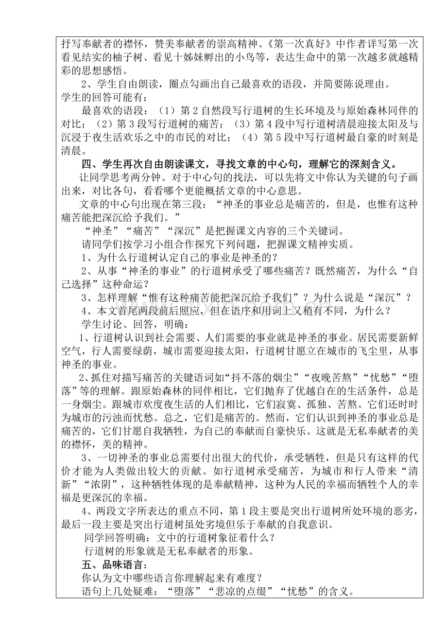 生命是美好的,属于人们只有一次,这仅有的一次生命应当怎样度过呢?行道树的事业是神圣的,因为它蕴蓄着深沉;行道树的形象是感人的,因为它是无私奉献者的写照。生命的意义在于什么呢?前苏联作家奥斯特洛夫斯基在《钢铁是怎样炼成的》中是这样说的:“人的一生应当这样度过:当他回首往事时,他不因虚度年华而悔恨,也不因碌碌无为而羞耻。这样,在临死的时候,他就能够说:‘我已把自己的整个生命和全部精力,都献给了世界上最壮丽的事业——为全人类的解放而斗争。’”请同学们诵读体会这句格言的意义,品味充满理想与信念的人生境界。