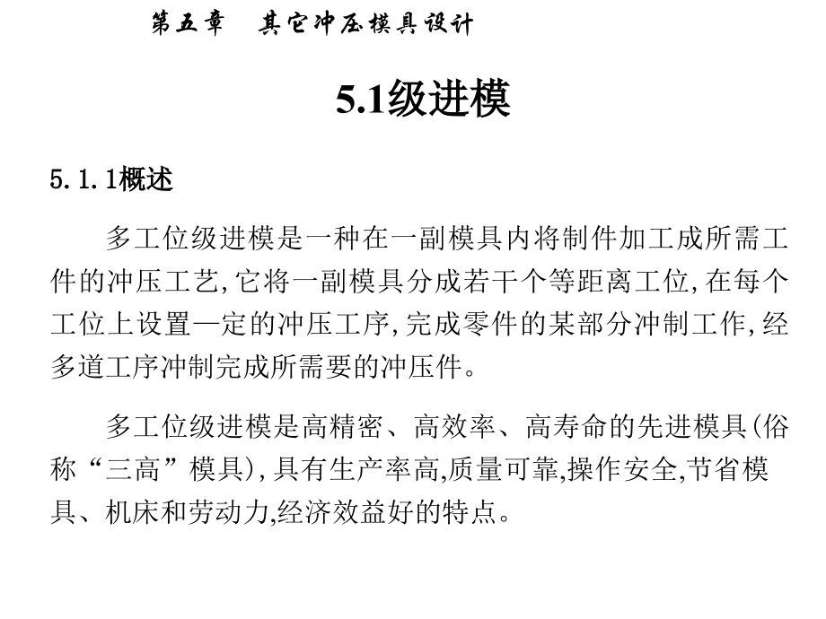 单击此处编辑母版标题样式,单击此处编辑母版文本样式,第二级,第三级,第四级,第五级,第五章其它冲压模具设计,第五章其它冲压模具设计,5.1,级进模,5.2,成型模,习题,5.1,级进模,5.1.1概述,多工位级进模是一种在一副模具内将制件加工成所需工件的冲压工艺,它将一副模具分成若干个等距离工位,在每个工位上设置定的冲压工序,完成零件的某部分冲制工作,经多道工序冲制完成所需要的冲压件。,多工位级进模是高精密、高效率、高寿命的先进模具(俗称“三高”模具),具有生产率高,质量可靠,操作安全,节省模具、机床和劳动力,经济效益好的特点。,1.按冲压工序性质分,1)冲裁多工位级进模,有冲落形式级进模和切断形式级进模。冲落形式级进模完成多道冲孔工序后落料;切断形式级进模完成冲孔等冲裁工位后切断。,2)成型工序多工位级进模,(1)以冲裁为主,且分别包括弯曲、拉深、成型某一工序或某两个工序的有:冲裁弯曲多工位级进模、冲裁拉深多工位级进模、冲裁成型多工位级进模、冲裁弯曲拉深多工位级进模、冲裁弯曲成型多工位级进模和冲裁拉深成型多工位级进模等。,(2),由几种冲压工艺结合在一起的冲裁、弯曲、拉深、成型多工位级进模。,2.按级进模的设计方法分,1)封闭形孔连续式级进模,这种级进模的各个工作形孔(除定距侧刃形孔外)与被冲零件的各个孔及制件外形(弯件指展开外形)的形状一致,并把它们分别设置在一定的工位上,材料沿各工位经过连续冲压,最后获得所需冲件。用这种方法设计的级进模称封闭形孔连续式级进模。如图,5-1,所示为冲制制件及其展开图和排样图。,图5-1冲压件、展开图和排样图,(a),冲压件,;(b),展开图,;(c),排样图,2)分断切除多段式级进模,这种级进模对冲压零件的复杂异形孔和零件的整个外形采用分段切除多余废料的方式进行,即在前一工位先切除一部分废料,在以后工位再切除一部分废料,经过逐个工位的连续冲制,就能获得一个完整的零件或半成品。对于零件上的简单形孔,模具上相应的形孔可与零件上的形孔做成一样。,图5-1所示零件,采用分断切除多段式级进模时其排样图如图5-所示,共分八个工位,:,第一工位:冲导正钉孔。,第二工位:冲21.8孔。,第三工位:空位。,第四工位:冲切两端局部废料。,第五工位:冲两工件间的分断槽废料。,第六工位:弯曲。,第七工位:冲中部312长方孔。,第八工位,:,切载体。,图,5-2,分断切除多段式级进模条料排样图,分断切除多段式级进模的特点:分断切除多段式级进模其工位数比封闭形连续级进模多;在分断切除废料过程中可以进行弯曲、拉深、成型等工艺,一般采用全自动连续冲压。这种模具结构复杂,制造精度高;由于能冲出完整零件,因此生产率和冲件的精度都很高。,在设计多工位级进模时,还应根据实际生产中的问题,将这两种设计方法结合起来,灵活运用。,5.1.2多工位级进模的设计步骤,多工位级进模结构复杂、精密、高速冲压,造价高,制造周期长,所以设计多工位级进模时,应十分细致、全面地考虑问题。一般主要按以下步骤进行:,(1)接受设计任务,研究原始资料,收集有关数据。,冲压产品制件图和模具设计任务书各一份。,冲压产品制件试制生产的技术数据与样件。例如弯曲件的展开尺寸、弯曲过程的各工序零件图,;,拉深件的坯料尺寸,拉深次数及工序件尺寸等。,(2)进行工艺计算,将收集的数据及资料,根据多工位级进模中的受力状态进行工艺计算,并修改有关数据。,(3)绘制零件展开图,设计条料排样图并进行工艺会审。,(4)模具结构设计,并绘制装配草图。,(5),绘制模具装配图、零件图,编写模具使用维修说明书。,说明书内容:选用的压力机、模具闭合高度、轮廓尺寸、规定行程范围及每分钟冲压次数等;选用自动送料机构类型,送料步距及公差,安装调整要点;模具刃磨和维修注意点(哪些凸模或凹模需拆下刃磨,刃磨后如何调整各工作部分高度差值)。对易损件及备件应有零件,明细表。,5.1.3多工位级进模的总体设计,1.排样图设计,多工位级进模设计中,排样图的合理及正确与否,直接影响到制件精度与能否顺利地进行冲压生产,并且关系到材料的利用率。因此,排样图是多工位级进模设计的依据,也是关键工作之一。,根据制件图样尺寸,计算制件的展开尺寸,进行排样,并计算各种排样方式的材料利用率,分析制件精度是否能达到图样要求,能否在模具中顺利地进行自动连续冲压。将各种方案比较,选用最佳方案。,1)排样图设计原则,(1)合理确定工位数。在不影响凹模强度的原则下,工位数选得越少越好。,(2)适当设置空工位。有时为了提高凹模强度或便于安装凸模,在排样图上设置空工位,在空位上不对条料进行冲压加工。,(3)考虑材料的利用率,尽量按少、无废料排样,以便降低成本、提高经济效益。多排或双排排样比单排排样要节省材料,但模具制造困难,给操作也带来不便。,(4)合理确定冲裁位置。凹模孔型距离太近影响其强度,太远又会增大模具外形,浪费材料,且降低冲裁精度。,(5)为保证条料送进步距的精度,必须设置导正孔,其位置尽可能设置在废料上,这样可增大导正直径,使工作更为可靠。,(6)有冲孔与落料工序时,冲孔在前,有时可以将以冲孔作为导正孔。若工件上没有孔,则可在第一工位上设置工艺孔,以做导正孔用。,(7)制件上的孔位置精度要求高时,在不影响凹模强