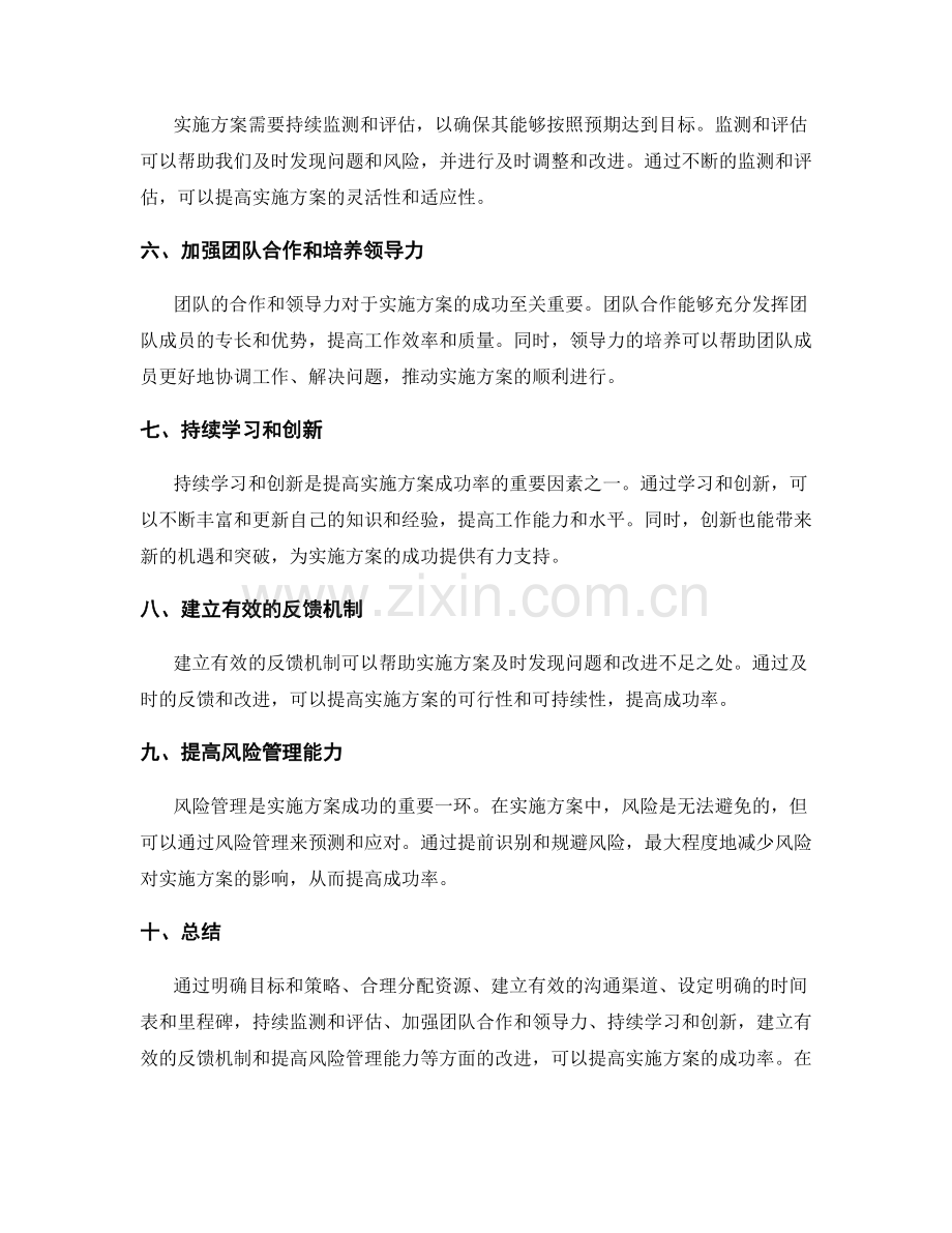 通过明确目标和策略、合理分配资源、建立有效的沟通渠道、设定明确的时间表和里程碑,持续监测和评估、加强团队合作和领导力、持续学习和创新,建立有效的反馈机制和提高风险管理能力等方面的改进,可以提高实施方案的成功率。在实践中,我们需要不断总结和积累经验,不断优化和改进实施方案,以更好地实现目标。通过有效的实施,我们才能为个人、组织和社会创造更大的价值。