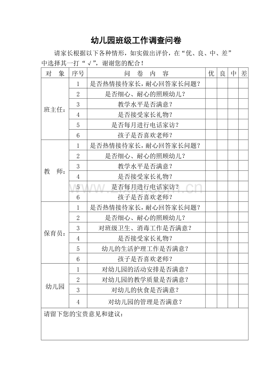 幼儿园班级工作调查问卷