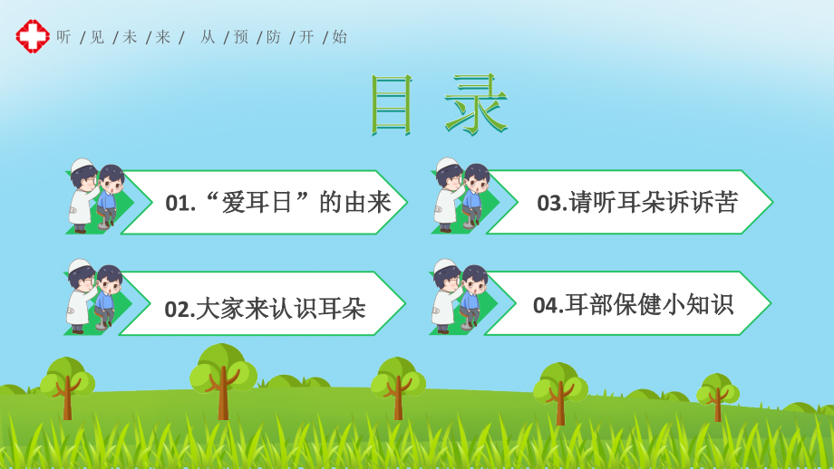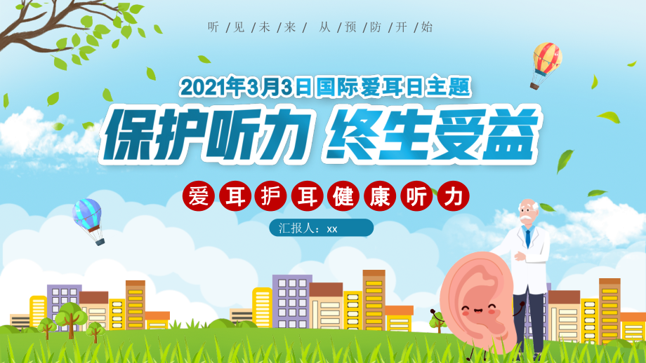 单击此处编辑母版标题样式,单击此处编辑母版文本样式,第二级,第三级,第四级,第五级,爱,耳,护,耳,健,康,听,力,汇报人:,xx,听,/,见,/,未,/,来,/,从,/,预,/,防,/,开,/,始,听,/,见,/,未,/,来,/,从,/,预,/,防,/,开,/,始,目录,01.,“爱耳日”的由来,02.,大家来认识耳朵,03.,请听耳朵诉诉苦,04.,耳部保健小知识,PART,01,“爱耳日”的由来,“爱耳日”的由来,1998,年,3,月,在政协第九届全国委员会第一次会议上,社会福利组,15,名委员针对我国耳聋发病率高、数量多、危害大,预防薄弱这一现实,提出了,关于建议确立爱耳日宣传活动,的提案。,经中国残疾人联合会、卫生部等,10,个部门共同商定,自,2000,年起确定每年,3,月,3,日为全国爱耳日。,2013,年起我国“爱耳日”被定为国际“爱耳日”。,可通过初级耳科保健加以预防和避免。初级耳科保健是预防听力残疾最基本、最经济、最有效的手段和途径。,全球有,3.6,亿听力残疾人,占全球总人口的,5.1%,“爱耳日”的由来,听力残疾中,50%,PART,02,大家来认识耳朵,大家来认识耳朵,是指能从人体外部看见的耳朵部分,即耳廓和外耳道。,由鼓膜、中耳腔和听骨链组成。,位于颞骨岩部内,包括半规管、前庭和耳蜗。,耳朵的结构分为三部分,外耳,中耳,内耳,大家来认识耳朵,我们怎么听到声音的呢?,人的耳廓像一个卫星接收器,能接收声波,并将其汇聚到外耳道,然后,再传到鼓膜,引起鼓膜振动,鼓膜的振动可带动与之相连的听小骨,而听小骨的活动又可振动内耳的门户,-,卵圆窗膜,使内耳中的淋巴液产生振动,从而引起内耳基底膜振动,刺激基底膜上的细胞产生与之对应的电位变化,这种电信号汇聚到听神经中,再通过听神经输送到大脑中的听中枢,直到这时,人才算真正“听”到声音。,耳鸣是一种在没有外界声、电刺激条件下,人耳主观感受到的声音。值得注意的是,耳鸣是发生于听觉系统的一种错觉,是一种症状而不是疾病。,大家来认识耳朵,引发及耳鸣加重的原因,耳鸣,噪声,特殊药物,精神紧张,不良习惯,颈椎病,高血压,常 见 的 耳 聋 种 类 有 那 些?,传导性耳聋,感觉神经性耳聋,混合性耳聋,PART,03,请听耳朵诉苦,请听耳朵诉苦,耳朵的小苦恼,目前,我国听力语言障碍人数高达两千多万,而在这些存在听力障碍的人当中,因为不注意保护而造成后天失聪的占,80%,以上,耳部及听力受伤害的群体越来越趋向年轻化。,耳聋、耳鸣和中耳炎是临床最常见的耳部疾病,除了少部分先天患者之外,大部分后天耳部疾病是由于不良的生活方式、用耳方式造成的,一些所谓的时尚生活对耳朵的伤害尤其严重。,听力损失,25dB,以下一般无语言障碍,平均听力损失,26-40dB,会不同程度的影响语言,平均听力损失,41-55dB,影响幼儿的语言学习,平均听力损失,56-70dB,语言迟缓且发音异常,平均听力损失,71-90dB,不能分辨言语声可导致语言障碍,平均听力损失,90dB,以上语言障碍明显不能进行正常的社会交往,请听耳朵诉苦,耳聋对语言发展有何影响?,请听耳朵诉苦,耳朵美容可能损害健康,“耳烛”使用不当伤耳道,耳烛的做法很简单,只要侧身躺下,把一根特制的、空心的“蜡烛”圆头的一端插到耳中,然后把耳烛点燃。,据美容人员介绍,耳烛里含有多种天然的植物精油和蜂蜡成分,而且还要经过薄荷等多味中草药的浸泡,利用燃烧后所产生的负压,在耳内产生真空状态,通过渗入作用及传热效应使芳香精油直接进入颅内和体内,激发脑部中枢神经。可以缓解大脑疲劳、帮助改善记忆力,改善睡眠。,请听耳朵诉苦,专家提醒,耳朵的结构极其复杂,耳道又窄又深,只能用专门的耳镜才能观察到,没有经过专门培训的人根本搞不清楚耳朵的内部结构。在这种情况下,盲目地把异物伸进耳朵,一不小心就会造成鼓膜穿孔。,耳道是由鼓膜所封闭的,任何烟雾和香气都不可能通过耳朵进入身体。如果说香气可以在一定程度上缓解大脑疲劳和身体压力,那么只能通过鼻子呼吸才能达到。,耳烛点燃后其火焰顶端的温度很高,如有不慎,可能造成高温烫伤耳道,还有可能引起感染和炎症。,对于时尚、爱美的人来说,扎耳洞早就像家常便饭一样平常了。有的人在一个耳朵上扎七八个耳洞,再穿上各色各样的耳钉、耳环、耳线,看起来很有个性,但也因此产生了一些健康隐患。,软骨非常脆弱,一旦刺破软骨,造成其血液循环和免疫系统出现问题,细菌极易侵入造成发炎、感染,使软骨的伤口溃烂,很难治疗。而且,一旦造成发炎,发炎的软骨就会被炎症侵蚀掉,也就是说,这块软骨就没有了,整个耳廓就会出现畸形,在发炎的部位凹进去一块。,请听耳朵诉苦,过多扎耳洞很危险,掏耳朵是我们日常生活中经常要进行的“活动”,不光是为了干净,还因为掏起来特别舒服、过瘾。用发夹、挖耳勺等很深、很用力地掏耳朵。这样掏很容易造成鼓膜穿孔,影响听力,甚至导致中耳炎。,耳屎在医学上称为耵聍,是耳道皮肤正常分泌物结合皮屑等形成的。一般少量的屑状耵聍,会随运动时的震动和下颌运动自行排出。大块硬结的耵聍,则应该请耳科医生用专门工具取出,千万别自己掏。,请听耳朵诉苦,贪图“舒服”乱掏耳,在各种用耳的不良习惯中,就属吃药最容易被忽视,而且也是对耳朵伤害最大的。有些人在服用药物的时候不注意,一看药便宜,或是看到药效里有抗感染这项,也不管什么药拿来就吃。但是,像链霉素、卡那霉素、新霉素等药物就会损