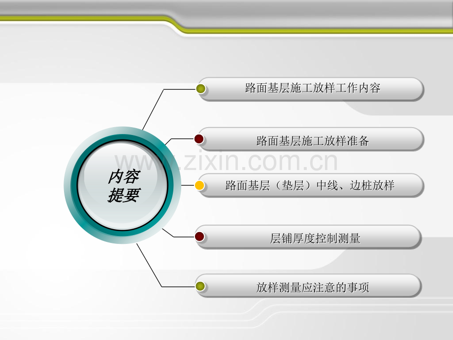 路面基层施工放样准备路面基层施工放样准备路面基层(垫层)中线、边桩放样路面基层(垫层)中线、边桩放样层铺厚度控制测量层铺厚度控制测量路面基层施工放样工作内容路面基层施工放样工作内容内容内容提要提要放样测量应注意的事项放样测量应注意的事项路面基层施工放样内容路面基层施工放样内容路面基层(垫层)施工测量的外业工作:(1)恢复中桩、左右边桩。规范要求直线段每1520 m设一桩,曲线段每1015 m设一桩,并在两侧边缘处设指示桩。施工实践中,为了更好地控制高程,方便推土机(或平地机)作业,一般情况下都是每10 m设一桩。(2)进行水平测量,用明显标志标出桩位的设计高程。(3)严格掌握各结构层的厚度和高程,其路拱横坡应与面层一致。路面基层施工放样准备路面基层施工放样准备仪器、设备及材料准备(1)路面基层施工放样准备路面基层施工放样准备仪器、设备及材料准备(2)路面基层施工放样准备路面基层施工放样准备仪器、设备及材料准备(3)路面基层施工放样准备路面基层施工放样准备已知成果的收集 (1)导线控制点或交点成果表 (2)沿线水准点成果表 (3)路基设计表 (4)直线、曲线及转角表 (5)逐桩座标表 (6)构造物一览表及桥面设计高程值路面基层施工放样准备路面基层施工放样准备施工放样数据准备 (1)准备施工段落中桩、本层左右边桩坐标或距中桩距离放样数据表(线路平面位置放样设计坐标表)。(2)准备施工段落中桩、左右边桩高程放样数据表(即线路高程位置放样的设计高程表)。路面基层施工放样准备路面基层施工放样准备直线段中桩坐标计算 JDn的坐标假定为(Xn,Yn),JDnJDn+1的坐标方位角为nn+1,P点在JDnJDn+1的直线段上,则P点的坐标按下式求得:式中:LpP点里程桩号 LYZ点或HZ点里程桩号路面基层施工放样准备路面基层施工放样准备曲线上中桩座标计算方位角计算 路面基层施工放样准备路面基层施工放样准备曲线上中桩座标计算主点桩坐标计算 路面基层施工放样准备路面基层施工放样准备曲线上中桩座标计算缓和曲线段各点坐标计算 式中:L缓和曲线上任意点至 ZH 点的弧长X=XZH+X Cosn-1,n-YSin n-1,n Y=YZH+XSin n-1,n+YCos n-1,n 式中:路线转向,右转角时=1,左转角时=-1路面基层施工放样准备路面基层施工放样准备曲线上中桩座标计算圆曲线段各点坐标计算 式中:L圆曲线上任意点至 ZH 点的弧长X=XZH+X Cosn-1,n-YSin n-1,n Y=YZH+XSin n-1,n+YCos n-1,n 式中:路线转向,右转角时=1,左转角时=-1路面基层施工放样准备路面基层施工放样准备边桩座标计算 如图所示,路线中线上任意一点P桩号为Lp,坐标为(Xp,Yp),切线坐标方位角为切。过P点的法线坐标方位角法按下式计算:法=切90 为计算方便,规定法方向总是指向中线右侧,左右两侧是相对于路线前进方向而言。横断面方向上任一点M,距离中线的距离(横支距)为L,规定中线左侧横支距为负,中线右侧横支距为正。则横断面方向上M点的坐标用下式计算:XM=Xp+Lcos法 YM=Yp+Lsin法路面基层(垫层)中线、边桩放样路面基层(垫层)中线、边桩放样放样内容 路面基层(垫层)中桩、边桩放样仍然是先恢复中线,然后由中线控制边线。基层横坡一般按直线形式放样。要注意有超高和加宽时,还要考虑路面超高加宽的设置。基层放样的主要内容分中、边桩平面放样和高程测量两部分。(1)恢复中桩、左右边桩,按规范要求,直线段每1520m设一桩;曲线段每1015m设一桩,并在两侧边缘处设指示桩。施工实践中,为了更好地控制高程,一般情况下都是每lOm设一桩。半径较小的,加密为5m桩距。边桩跟随中桩相应放出各点。(2)进行水准测量,根据已计算出的中桩及边桩的设计高程,用水准仪逐桩测出本层的设计高程,用明显标志标在桩位上。(3)严格掌握各结构层的厚度和高程,其路拱横坡应与面层一致。路面基层(垫层)中线、边桩放样路面基层(垫层)中线、边桩放样放样方法 (1)各结构层放出中线后,再根据中线的位置和横断面方向用钢尺丈量放出边桩。(2)在高等级公路路面施工中,实践中常采用全站仪坐标法或经纬仪配合测距仪极坐标法放样中桩、边桩。实践中,垫层、底基层所放桩位常采用竹桩(或木桩)标志;基层由于其表面坚硬,在放样进行中,可先用钢钉标出其位置,天气好时亦可用粉笔标出其位置,然后在施工铺筑前用钢钎标志。路面层施工,对于设有中央分隔带的,在放样时可一并放出中央分隔带边桩,也可在放出中桩、边桩后,在中、边桩连线上用皮尺(基层、面层应用钢卷尺)量距法加设中央分隔带边桩。路面基层(垫层)中线、边桩放样路面基层(垫层)中线、边桩放样人工加桩交汇法 直线段皮尺(或钢尺)交会法加桩,实际上就是几何中“解直角三角形”。a2+b2=c2 (勾股定理)式中,a假设为线路两中桩之平距,m;b假设为线路中桩至边桩距离,即半幅路宽,m。路面基层(垫层)中线、边桩放样路面基层(垫层)中线、边桩放样算例 图为是某公路中一段直线段,放样时只放出了中线每隔20 m的桩位,如图中K128+020、K128+040K128+080,其间10 m桩及左右边桩需自己放出。图中半幅路宽12.75 m。路面基层(垫层)中线、边桩放样路面基层(垫层)中线、边桩放样人工加桩中央纵距法 图中,已知半径R,弦长C(即曲线上AB两点之间平距,在公路线路曲线段上就是两相邻桩位之间平距),则只要求得y值,就可定出AB弧长中点K。在直角OBM(或直角0AM)中:式中,J0M长度,m;R曲线半径,m;C相邻两里