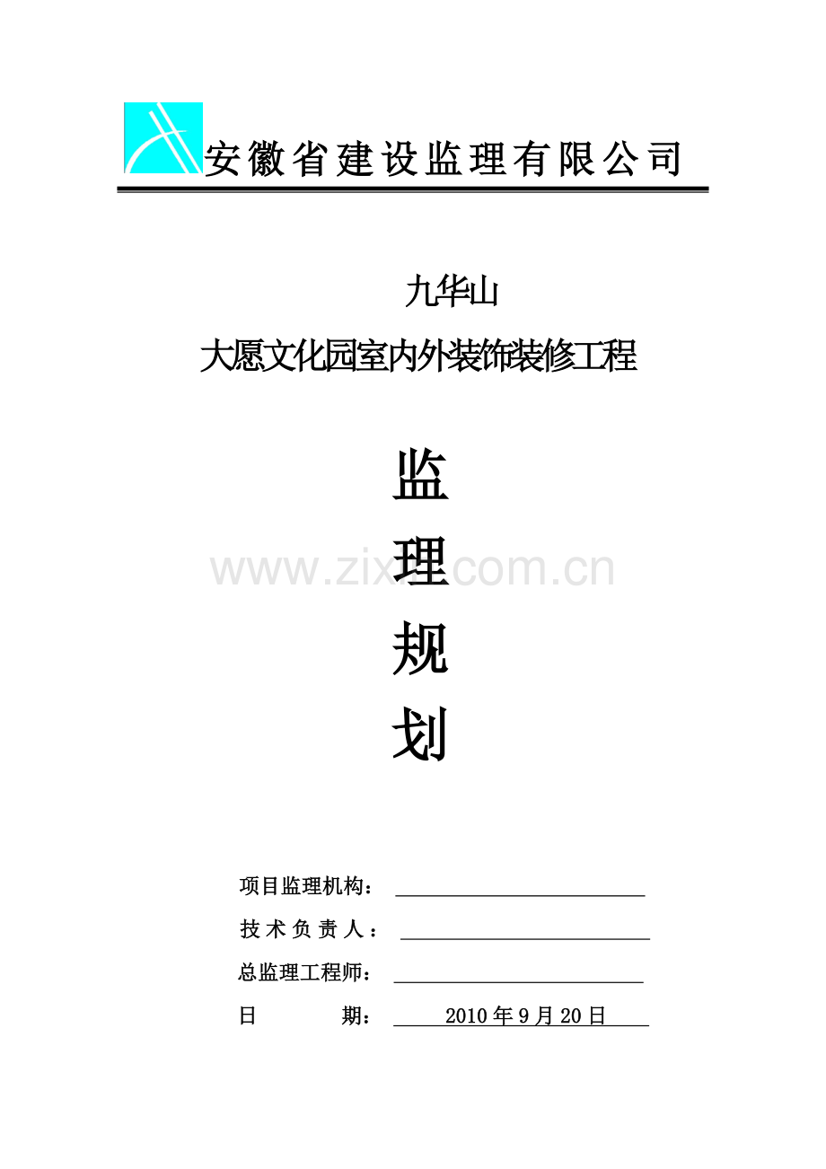 九华山大愿文化园装修装饰及安装工程《监理规划》系根据业主签定的监理监理委托合同等有关资料和国家有关工程建设监理的规定,地方有关工程建设监理的文件,建筑安装工程设计及施工验收规范,质量检验与评定标准等编制,包括工程概况、监理工作的目标和范围、监理的工作内容及依据、监理组织机构及人员职责、各阶段监理工作的主要内容及方法、监理工作的制度共六项内容。