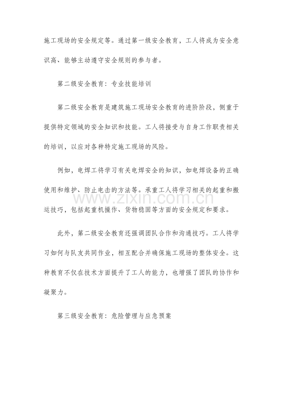 第三级安全教育还注重危险管理和风险评估的方法。工人将学习如何识别和评估潜在风险,并制定相应的预防措施和应急预案。这样的培训将使工人对施工现场的潜在危险有更深入的了解,并提高他们在危急情况下的自我保护能力。