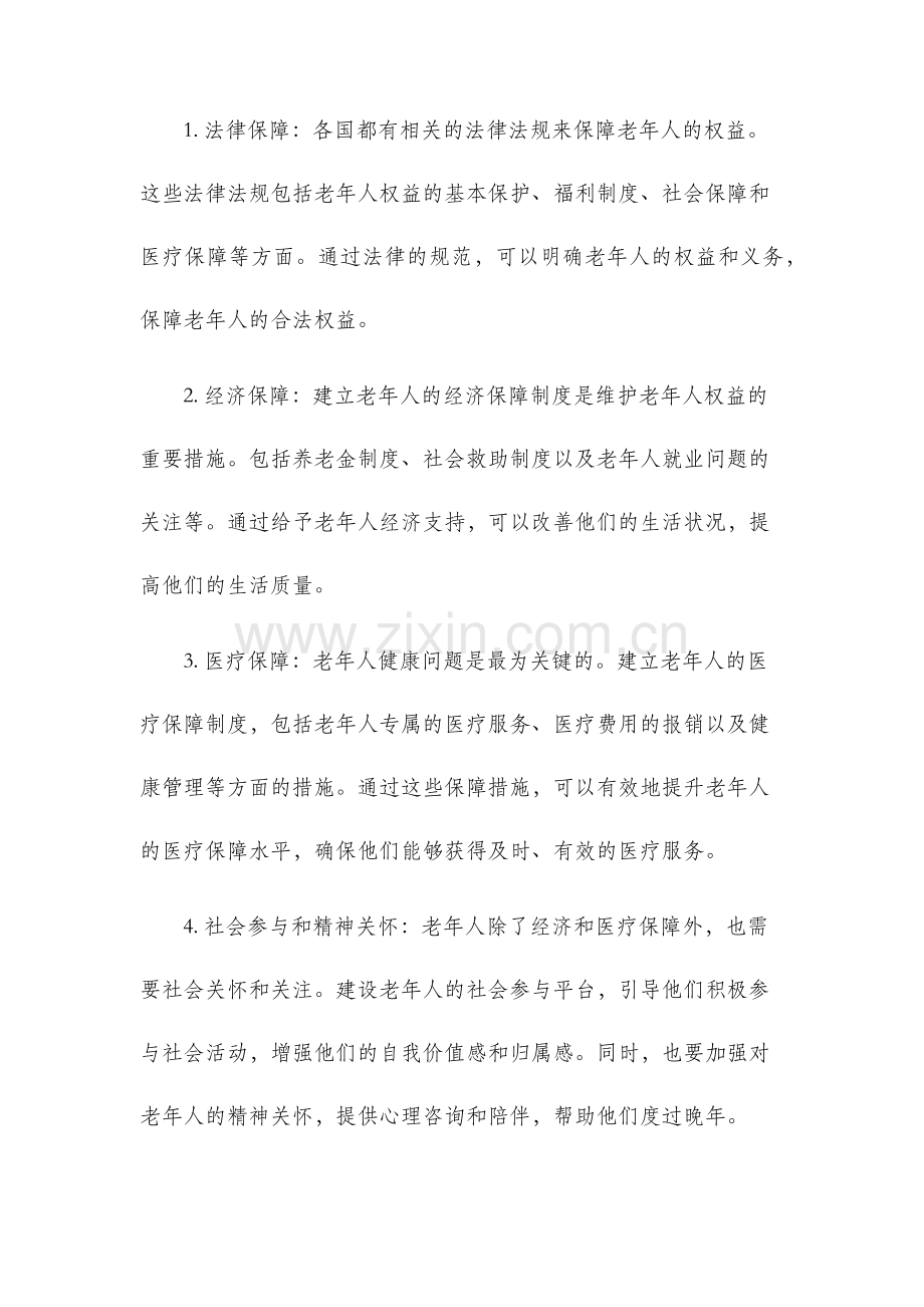 1. 法律保障:各国都有相关的法律法规来保障老年人的权益。这些法律法规包括老年人权益的基本保护、福利制度、社会保障和医疗保障等方面。通过法律的规范,可以明确老年人的权益和义务,保障老年人的合法权益。