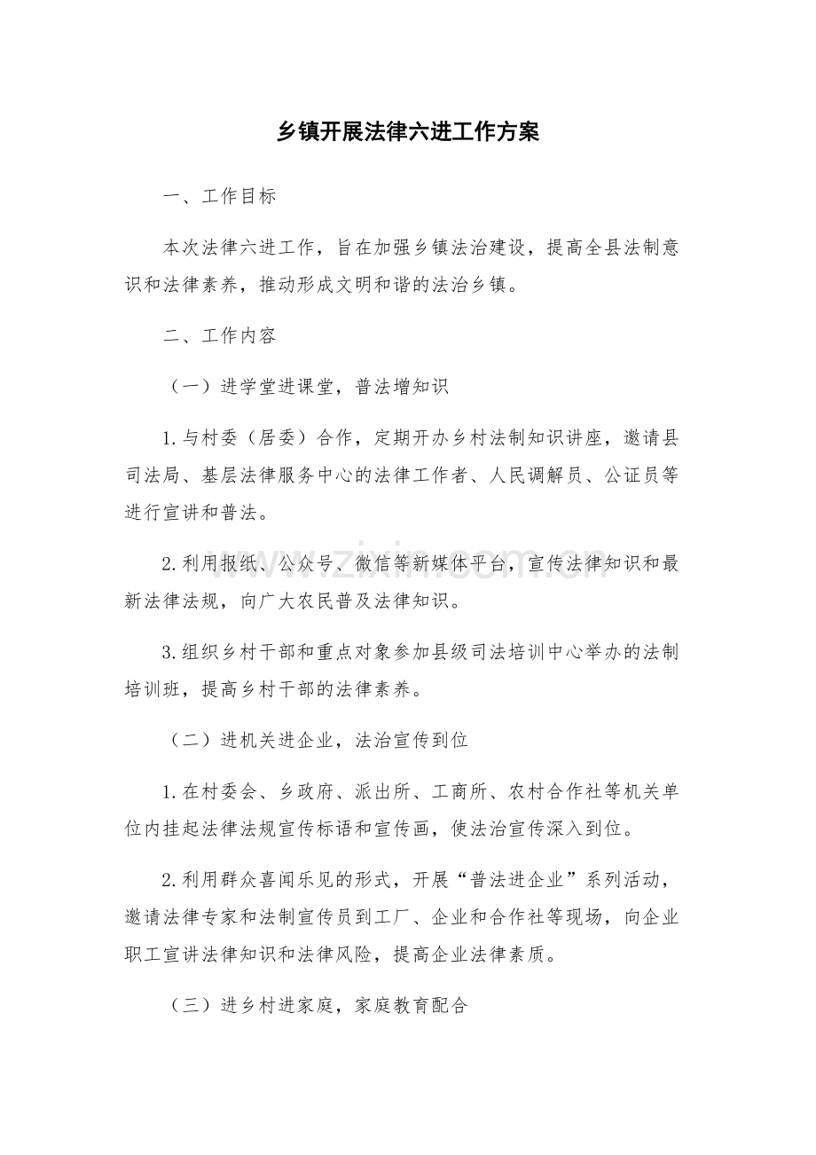 总之,开展法律六进工作是加强乡镇法治建设,深化基层法制建设的重要举措。希望各乡镇相关部门在工作中认真落实本方案,提升全县法律素质,建设法治乡镇。