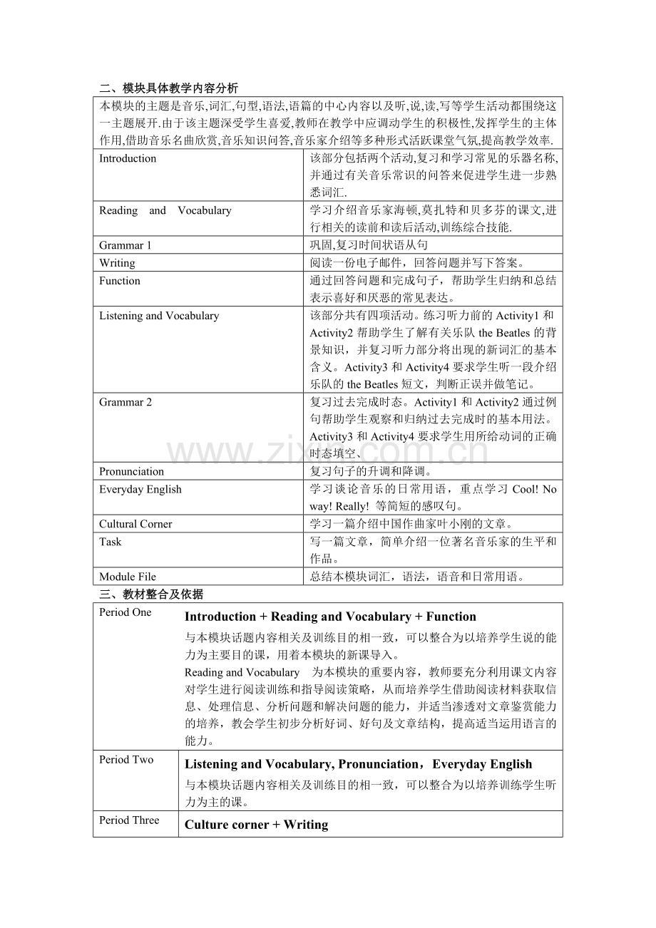 本模块主题是音乐,两篇阅读文章分别介绍了三位外国音乐家和一位中国音乐家。音乐是学生非常感兴趣的一个话题,教师应该在帮助学生应用新学到的语言知识,开展听,说,读,写等语言实践活动的同时,丰富学生的音乐知识,提高学生的艺术修养。