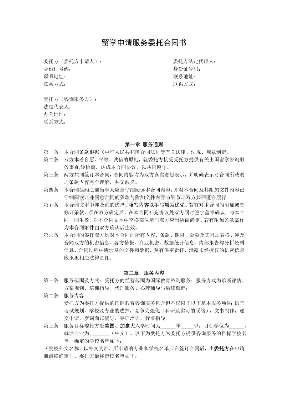第一条 申请服务期:本合同签订后,受托方为委托方提供的咨询服务自动进入申请服务期。申请服务期在委托方寄出所有学校申请文件材料或委托方向受托方递交《申请服务期确认表》后结束。