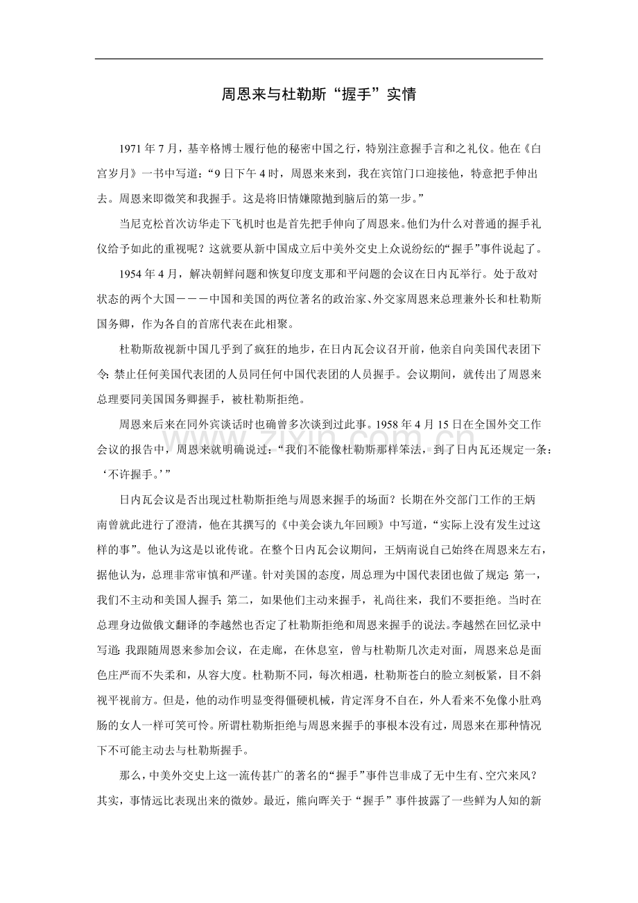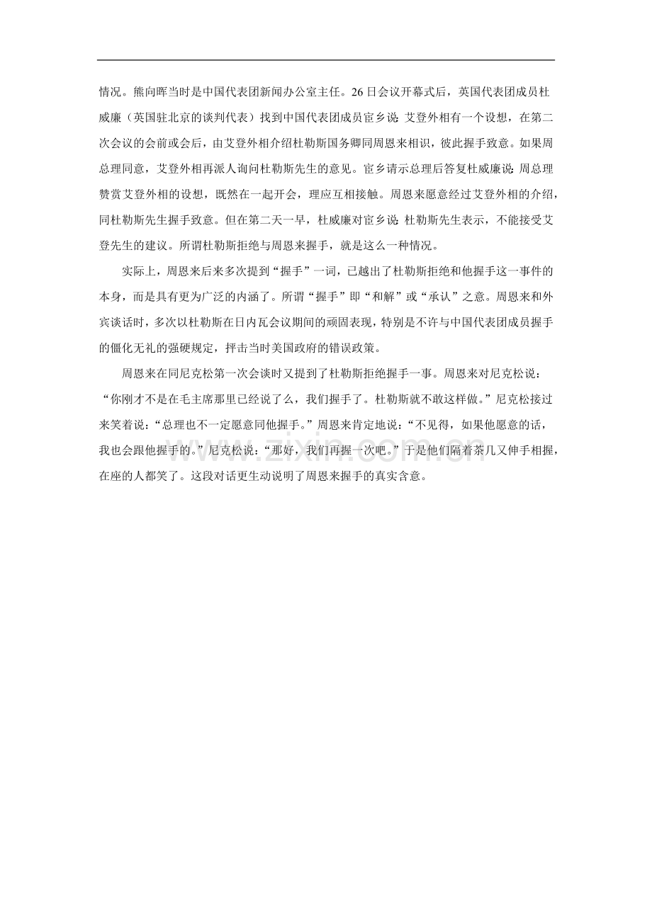 周恩来后来在同外宾谈话时也确曾多次谈到过此事。1958年4月15日在全国外交工作会议的报告中,周恩来就明确说过:“我们不能像杜勒斯那样笨法,到了日内瓦还规定一条:‘不许握手。’”