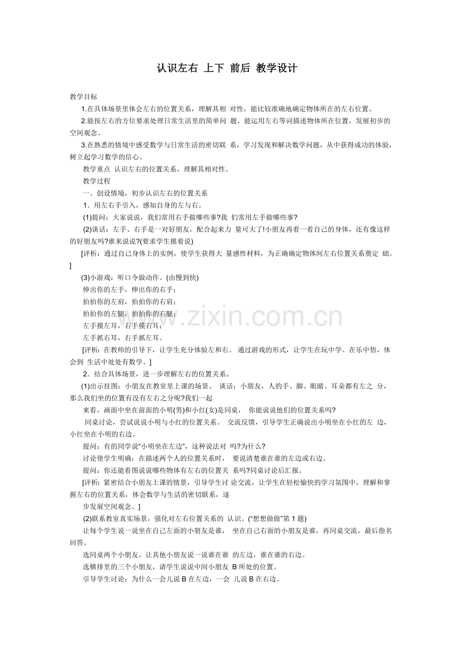 (1)出示挂图:小朋友在教室里上课的场景。 谈话:小朋友,人的手、脚、眼睛、耳朵都有左之 分,那么我们坐的位置有没有左右之分呢?我们一起