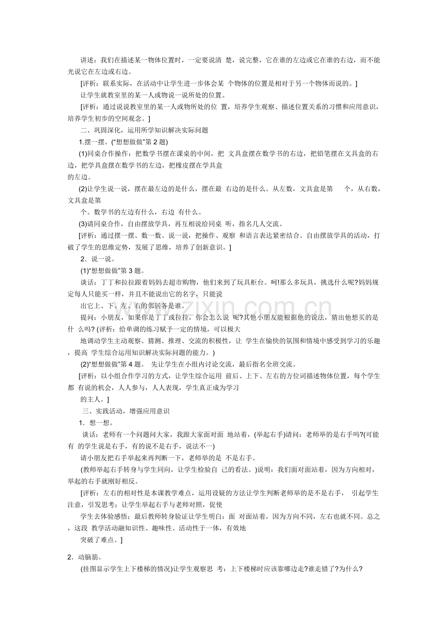 [评析:紧密结合小朋友上课的情景,引导学生讨 论交流,让学生在轻松愉快的学习氛围中,理解和掌 握左右的位置关系,体会数学与生活的密切联系,逐