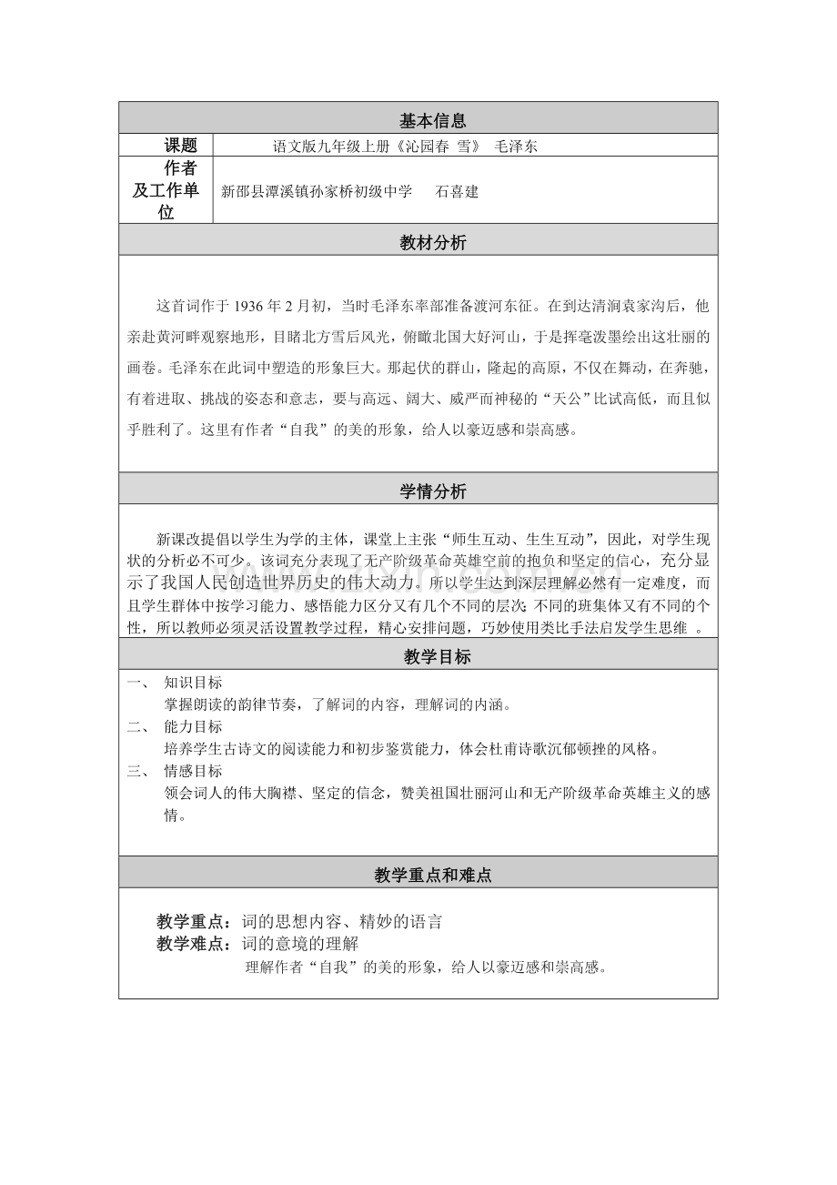 教学这首《沁园春雪》时,我想尝试改变这两点。首先是设计、组织形式多样的有吸引力的学生活动,调动学生的兴趣,营造主动学习的氛围,让学生真正成为课堂的主人,在课堂上动起来。这堂课我运用了听范读、自由读、齐读、个别读,引导学生真正学会读书,读出词味,也教会学生学习诗词重要方法——诵读法。其次是少点零敲碎打的分析,多一些整体的品味、感悟。新课标培养学生“具有一定语言感受能力”、“初步具有欣赏文学作品的能力”等要求都是从这一角度提出的。一开始的听范读和自由读都是整体感知,促使学生通过熏陶感染和朗读实践去感受整首词完整的音美、形美和意美。赏析的环节也是着眼整首词,引导学生品味词的准确、精练、富于形象性。 由于引导得当,学生积极思考、发言达到了预想的教学效果。