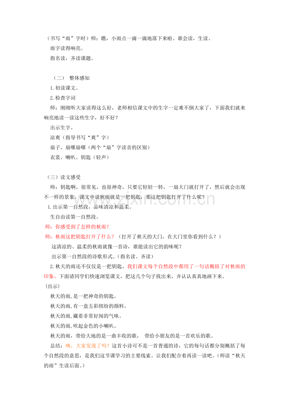 (一)了解课文抓住了哪些景物特点来写秋天的雨。并引导学生通过语言文字感受课文中描写的秋天美景,体会作者对秋雨的喜爱之情。
