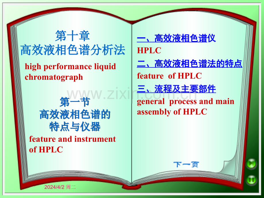 2024/4/2 周二第第十十章章高效液相色谱分析法高效液相色谱分析法一、一、高效液相色谱高效液相色谱仪仪HPLC二、高效液相色谱法的特点二、高效液相色谱法的特点feature of HPLC三、流程及主要部件三、流程及主要部件general process and main assembly of HPLC第一节第一节第一节第一节高效液相色谱的高效液相色谱的高效液相色谱的高效液相色谱的特点与仪器特点与仪器特点与仪器特点与仪器high performance liquid chromatographfeature and instrument of HPLC2024/4/2 周二第一节第一节 高效液相色谱的特点与仪器高效液相色谱的特点与仪器与经典液相色谱法比较与经典液相色谱法比较与气相色谱法比较与气相色谱法比较高效液相色谱的特点高效液相色谱的特点2024/4/2 周二 高高效效液液相相色色谱谱(HPLC)是是以以溶溶剂剂液液体体为为流流动动相相的的色色谱谱方方法法。按按照照固固定定相相不不同同可可分分为为:液液液液分分配配色色谱谱;吸吸附附色色谱谱(液液固固色色谱谱);离离子子交交换换色色谱谱;尺尺寸寸排排阻阻色色谱谱(凝胶渗透色谱凝胶渗透色谱)。早早期期液液相相色色谱谱,包包括括Tswett的的工工作作,都都是是在在直直径径15cm,长长50500cm的的玻玻璃璃柱柱中中进进行行的的。为为保保证证有有一一定定的的柱柱流流速速,填填充充的的固固定定相相颗颗粒粒直直径径多多在在150200 m范范围围内内。即即使使这这样样,流流速速仍仍然然很很低低(1mL/min),分析时间仍然很长!,分析时间仍然很长!2024/4/2 周二 当当加加压压增增加加流流速速(真真空空或或空空气气泵泵)时时,尽尽管管分分析析时时间间减减少少,但但柱柱塔塔板板高高度度Hmin也也相相应应增增加加了了!或或者者说说柱柱效效下下降降了了。为为了了解解决决分分析析时时间间及及柱柱效效问问题题,人人们们认认识识到到:最最为为有有效效地地增增加加柱柱效效的的唯唯一一方方法法是是减减小小填填充充物的粒径(物的粒径(310 m)!)!直直到到60年年代代,由由于于在在高高压压下下操操作作的的液液压压设设备备、高高效效固固定定相相以以及及高高灵灵敏敏检检测测器器的的出出现现及及发发展展,才才彻彻底底解解决决了了分分析析时时间间及及柱柱效效的的问问题题。即即所所谓谓的的高高效效液液相色谱技术才真正得到广泛应用。相色谱技术才真正得到广泛应用。2024/4/2 周二1.高效液相色谱与经典液相色谱方法的比较高效液相色谱与经典液相色谱方法的比较高高速速:HPLC采采用用高高压压输输液液设设备备,流流速速大大增增加加,分分析析速速度度极极快快,只只需需数数分分钟钟;而而经经典典方方法法靠靠重重力力加料,完成一次分析需时数小时。加料,完成一次分析需时数小时。高高效效:填填充充物物颗颗粒粒极极细细且且规规则则,固固定定相相涂涂渍渍均均匀匀、传传质质阻阻力力小小,因因而而柱柱效效很很高高。可可以以在在数数分分钟钟内内完完成数百种物质的分离。成数百种物质的分离。高高灵灵敏敏度度:检检测测器器灵灵敏敏度度极极高高:UV10-9g,荧荧光光检测器检测器10-11g。2024/4/2 周二色谱柱色谱柱:柱长柱长/cm 10 25 10 200 柱内径柱内径/mm 2 10 10 50固定相粒度固定相粒度:粒径粒径/m 5 50 75 600 筛孔筛孔/目目 2500 300 200 30色谱柱入口压力色谱柱入口压力/MPa 2 20 0.001 0.1色谱柱柱效色谱柱柱效/(理论塔板数理论塔板数/m)2 103 5 104 2 50进样量进样量/g 10-6 10-2 1 10分析时间分析时间/h 0.05 1.0 1 20高效液相色谱法高效液相色谱法经典液相经典液相(柱柱)色谱法色谱法项目项目高效液相色谱法与经典液相高效液相色谱法与经典液相(柱柱)色谱法的比较色谱法的比较2024/4/2 周二2.HPLC与与GC的比较的比较分分析析对对象象及及范范围围:GC分分析析只只限限于于气气体体和和低低沸沸点点的的稳稳定定化化合合物物,而而这这些些物物质质只只点点有有机机物物总总数数的的20%;HPLC可可以以分分析析高高沸沸点点、高高分分子子量量的的稳稳定定或或不不稳稳定定化化合合物物,这这类类物质占有机物总数的物质占有机物总数的80%。2024/4/2 周二流流动动相相的的选选择择:GC采采用用的的流流动动相相中中为为有有限限的的几几种种“惰惰性性”气气体体,只只起起运运载载作作用用,对对组组分分作作用用小小;HPLC采采用用的的流流动动相相为为液液体体或或各各种种液液体体的的混混合合,可可供供选选择择的的机机会会多多。它它除除了了起起运运载载作作用用外外,还还可可与与组组分分作作用用,并并与与固固定定相相对对组组分分的的作作用用产产生生竞竞争争,即即流流动动相相对对分分离离的的贡贡献献很很大大,可可通通过过溶溶剂剂来来控控制制和改进分离。和改进分离。操作温度:操作温度:GC需高温;需高温;HPLC通常在室温下进行通常在室温下进行。2024/4/2 周二有机溶剂或一定有机溶剂或一定 pH 值的缓冲溶液值的缓冲溶液按分离过程物理化学原理分类的各种液相色谱法的比较按分离过程物理化学原理分类的各种液相色谱法的比较吸附色谱吸附色谱分配色谱分配色谱离子色谱离子色谱体积排阻色谱体积排阻色谱全多孔固全多孔固体吸附剂体吸附剂固定液固定液+载体载体高效微粒离高效微粒离子交换剂子交换剂不同孔径的不