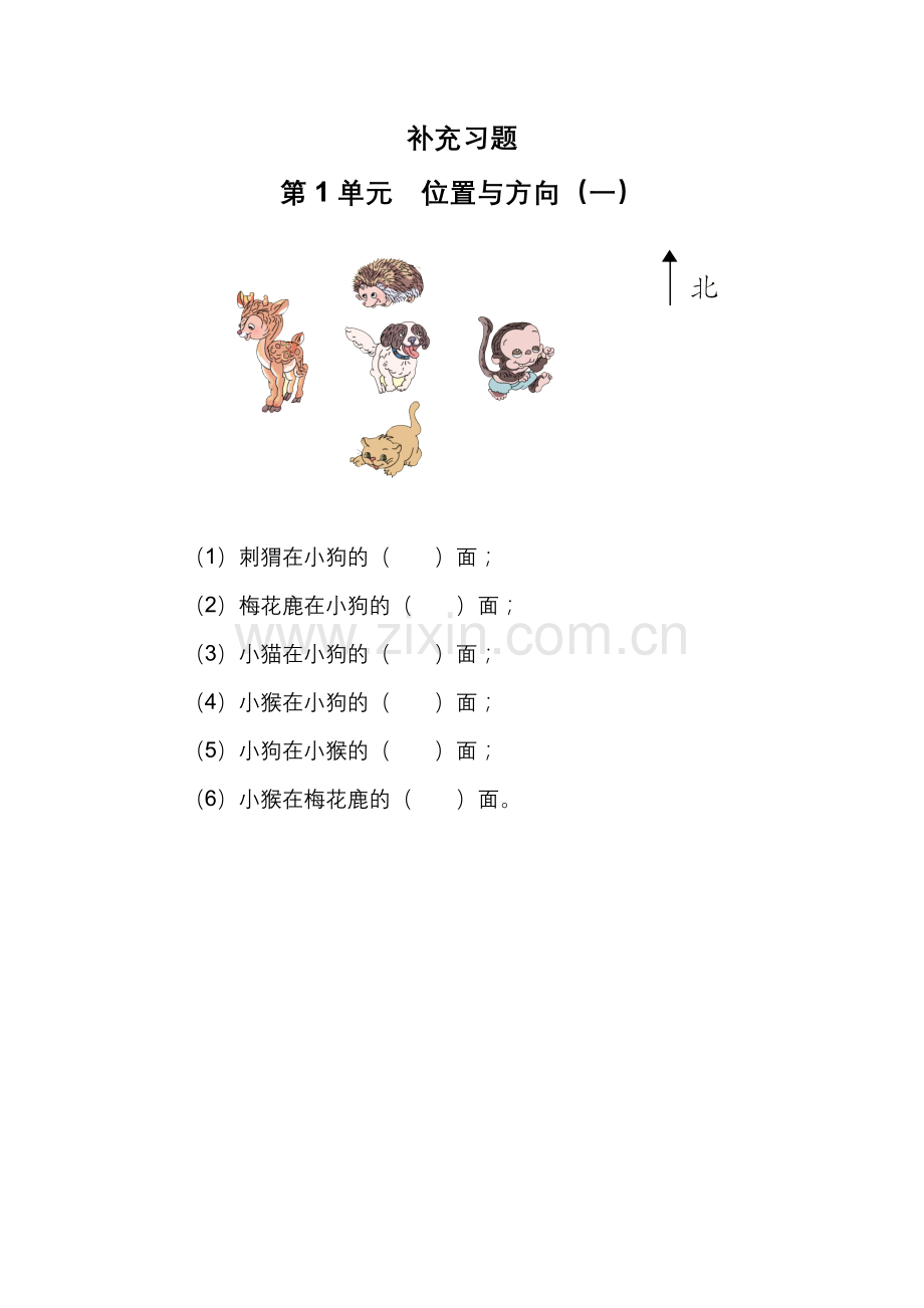 (5)小狗在小猴的(西)面;