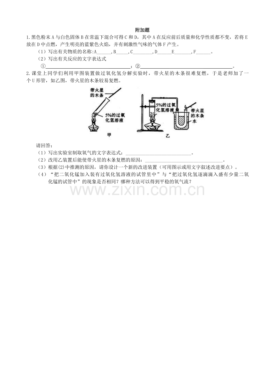 2.课堂上同学们利用甲图装置做过氧化氢分解实验时,带火星的木条很难复燃,于是老师加了一 个U形管,如乙图,带火星的木条较易复燃。