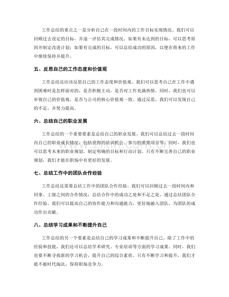 工作总结的重点和要素在于回顾过去的工作成果,查找不足和改进之处,总结成功经验,分析工作目标的实现情况,反思自己的工作态度和价值观,总结职业发展,总结团队合作经验,总结学习成果和不断提升自己,总结工作中的感悟和体会。通过深入的工作总结,我们可以不断提高自己,在职场中取得更大的成就。