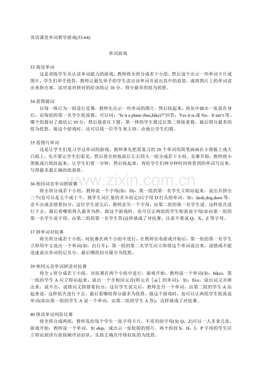 将全班分成若干小组,对抗赛在两个小组中进行,在教师宣布游戏开始后,第一组的第一名学生立即用中文说出一个单词(如:自行车),第一组的第二名学生应立即将这个单词说出来,说错或不能迅速说出单词的记负分,最后哪组扣分最少为优胜。