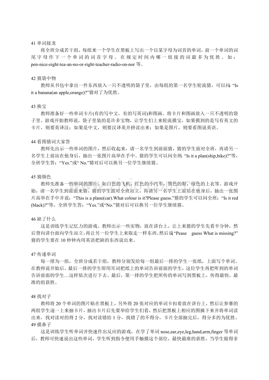 每一排为一组,全班分成若干组,教师分别发给每一组最后一排的学生一张纸,上面写个单词。在教师说开始后,最后一排的学生轻轻地把纸上的单词告诉前面的学生,这位学生再把听到的单词告诉前面的学生…… 这样依次进行下去。最后,第一排的学生把所传的单词写到黑板上,传得最快,最准的组获胜。