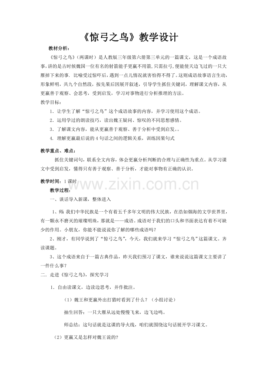 1、这只大雁一听到弦响,心里就害怕,以为又有箭射来,拼命往高处逃命,可见这是一只——(生)惊弓之鸟(师指课题)